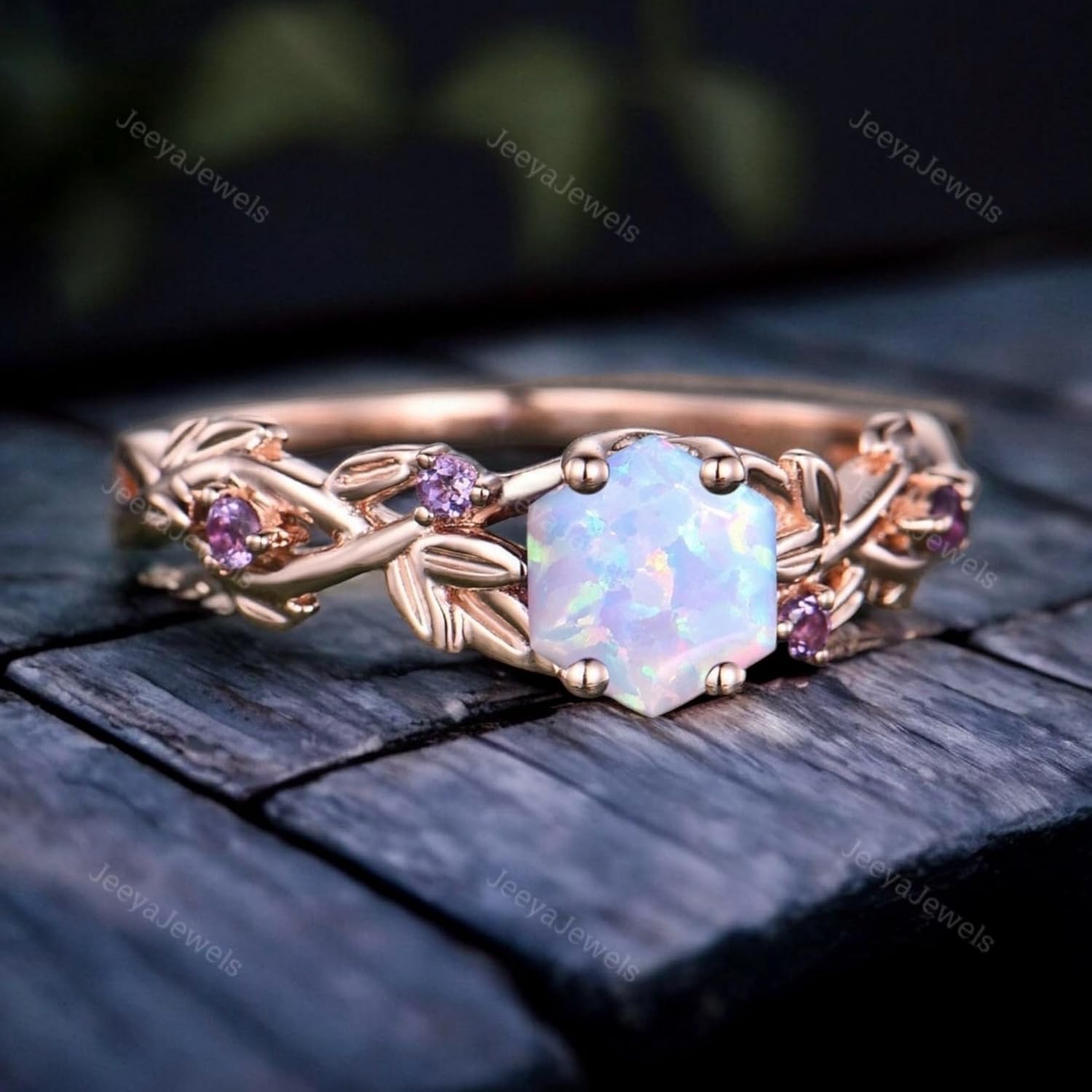 14K Solid Rose Gold Hexagon Cut Fire Opal Wedding Ring Leaf Branch Amethyst Bridesmaid Twig Ring Alternative Statement Everyday Ring For Her Delicate Valentine Gift Proposal Ring Discription :- Main Stone - Fire Opal Stone Color - Fire Opal Stone Shape - Hexagon Stone Size - 6 MM Second Stone - Amethyst Stone Shape - Round Stone Color - Purple