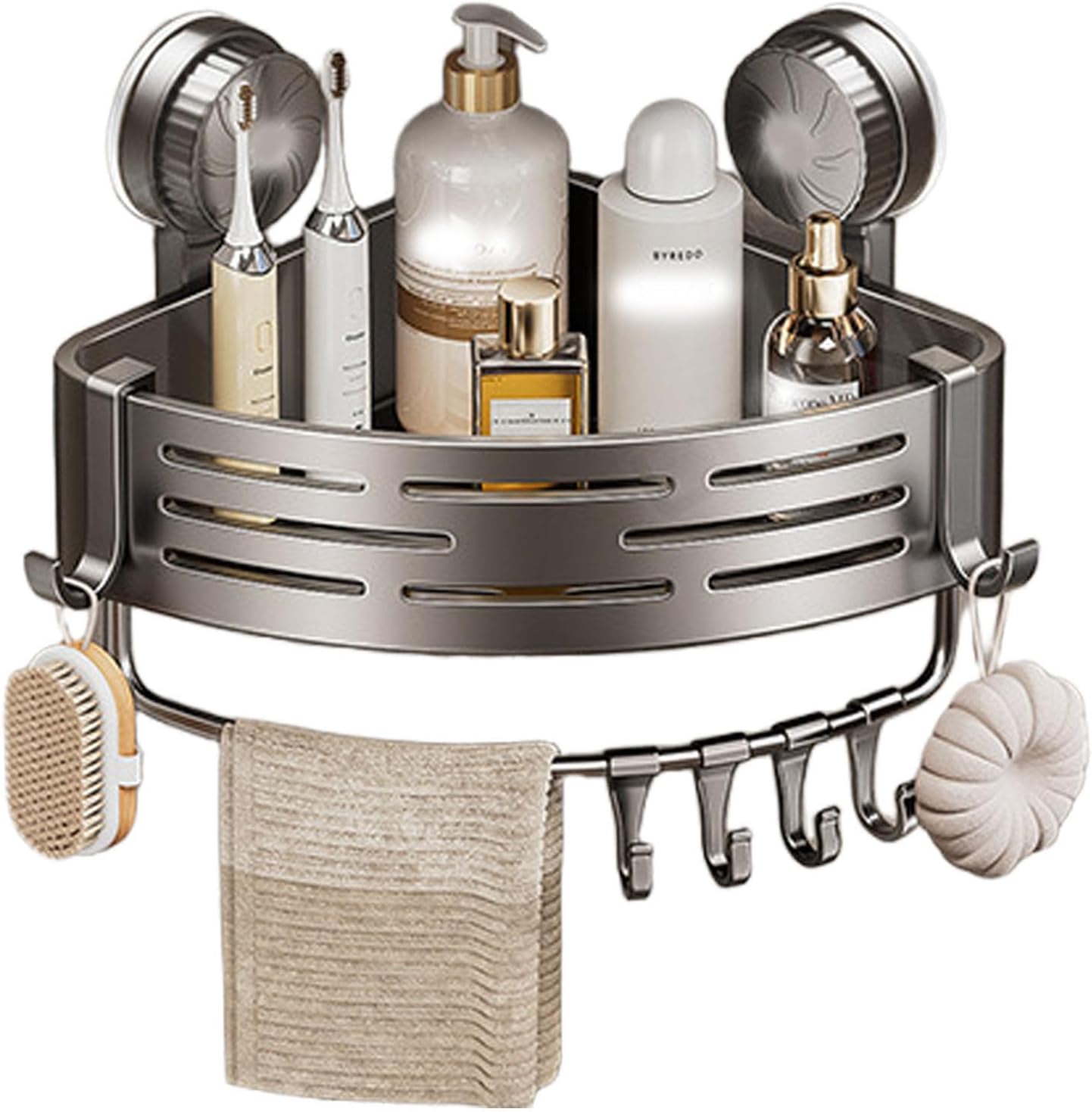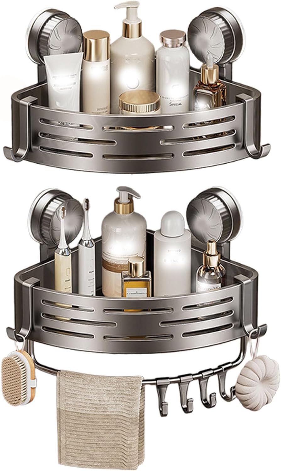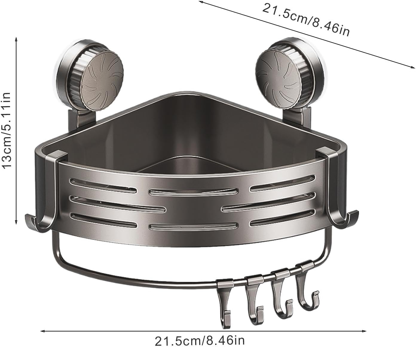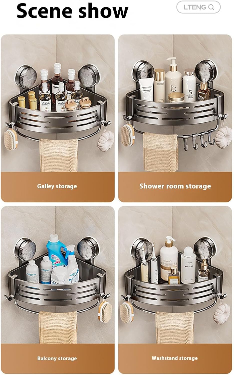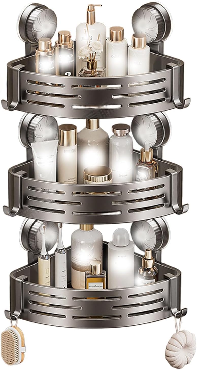 Product DescriptionWith its easy install design, you can have it up in minutes without damaging your walls. The strong load-bearing capacity and hollow bottom design make this shelf both functional and safe to use. Plus, it's suitable for storing bottles and toiletries of different heights.Product specifications:Product name: Corner Suction Storage RackProduct material: ABSProduct weight: about 250gProduct size: about 21.5x21.5x13cm/8.46x8.46x5.12 inchesPacking List:1xCorner Suction Storage RackNote:Due to different lighting and screen settings, the item color may be slightly different from the picture.Due to different manua