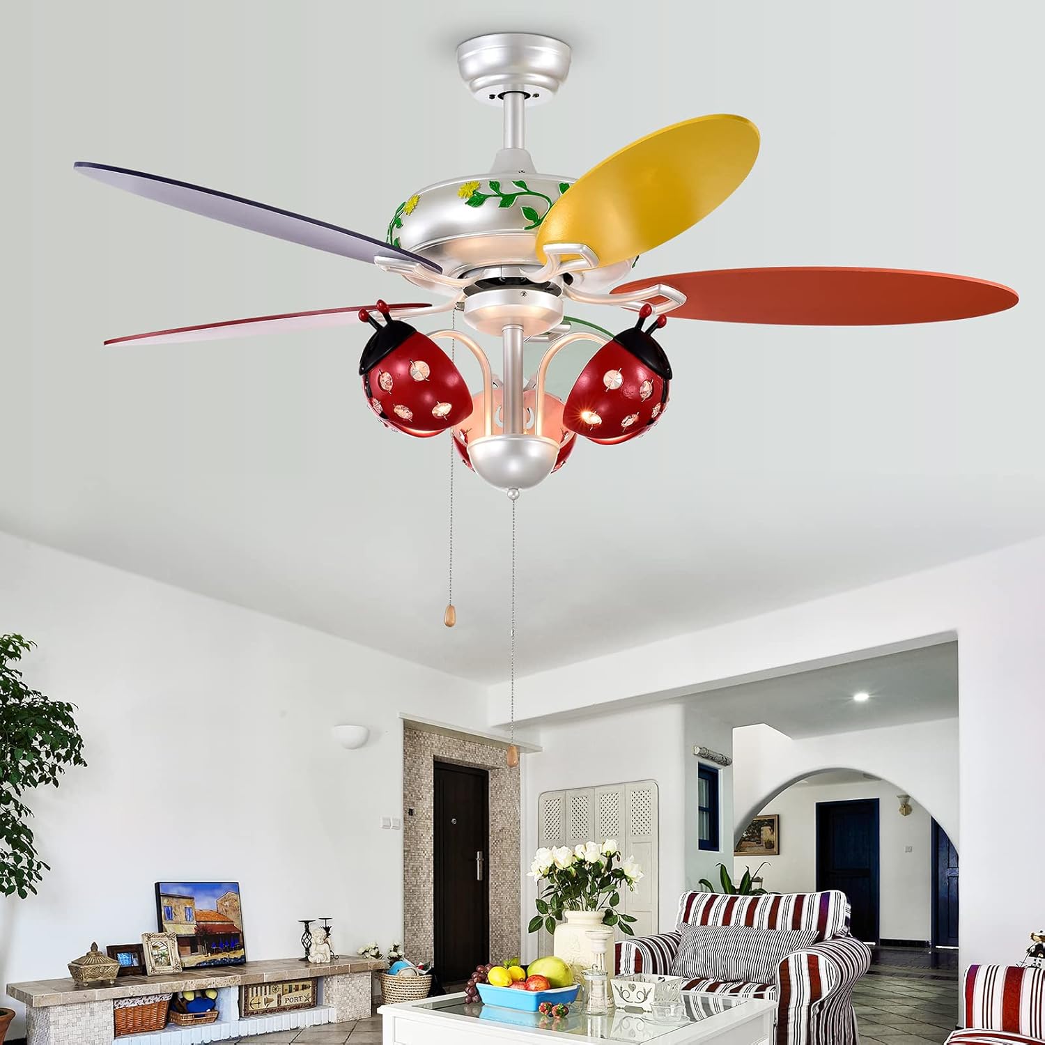 DescriptionLooking for a beautiful and practical children's ceiling fan? Our beetle ceiling fan is a perfect choice! Designed with special beetle lampshade and colorful blades, this kids ceiling fan opens the door to your children's color perception. Additionally, the powerful and reversible motor brings quiet operation, 2-way rotation for summer and winter and 3 adjustable speed for great convenience and practicability. Furthermore, the pull chains are convenient for you to control the fan and light. FeatureBeetle lampshade brings lovely addition to kids’ room Promotes children's color cognition ability with multi-color blades Easy to turn the ceiling fan on/off and adjust 3 wind speeds with pull chains The fan and light can be used independently Can be used in summer or winter thanks to its reversible motor Creates a quiet environment for kids to sleep or study Safe to use with ETL certification Suitable for different ceilings with 2 mounting options and heights SpecificationColor: Multi-color Material: Iron, MDF Size: 52" (Dia.) Length of downrods: 5"/10" Number of fan blades: 5 Net weight: 23 lbsStyle: Modern Voltage: 120V/60Hz Light source: 3 x E12 Bulb (not included) Motor speed: 67/119/174 RPM Air volume: 670/2975/5520 CFM Package includes: 1 x 52” Ceiling fan 1 x Instruction