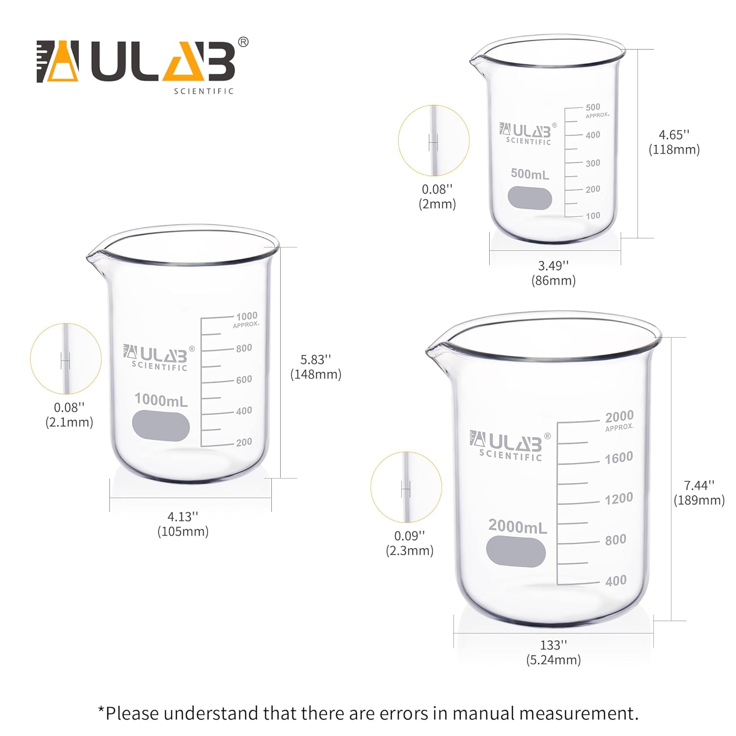 Please understand that as the glassware are fragile, the damage will occur during the transit. You can do the following options once got broken product. 1.Contact us for refund. ( If the remaining items are enough to use) 2.Contact Amazon for replacement. ( If replacement is required ) Including 3 size of glass beakers, 500ml (17oz) , 1000ml (34oz) and 2000ml (68oz), made in 3.3 Borosilicate glass material, Griffin Low Form with Printed Graduation. These beakers will withstand repeated standard autoclave cycles of 121°C at 15 psi for 5 minutes. They are designed for heating by hot plate, flame, oven, microwave or heating mantles. In normal service it can be heated many times to 230°C. It can be heated one time to 490°C in extreme service. This product can be cooled to -230°C. DO NOT plunge product directly into a liquid coolant. Place the product in the vapor phase of the liquified gasses for slow cooling prior to immersion in the coolant. Remark: 1. Not suggest use beaker for accurate measuring. 2. There should be no water droplets on the outer wall of the beaker when heated, Otherwise it will cause uneven heating. 3. When heating the liquid in the beaker, do not exceed 2/3 of the volume of the beaker, generally 1/2 of the volume of the beaker is appropriate. 4. During the dissolution or dilution process, when stirring with a glass rod, do not touch the bottom or wall of the beaker. 5. When heating corrosive drugs, a watch glass can be covered on the mouth of the beaker to prevent the liquid from splashing. 6. The beaker is a common laboratory glassware, usually made of glass, plastic or heat-resistant glass. The beaker is cylindrical, with a notch on the top side, which is convenient for pouring liquid. Some beakers are also marked with a scale on the outer wall to roughly estimate the volume of liquid in the beaker.