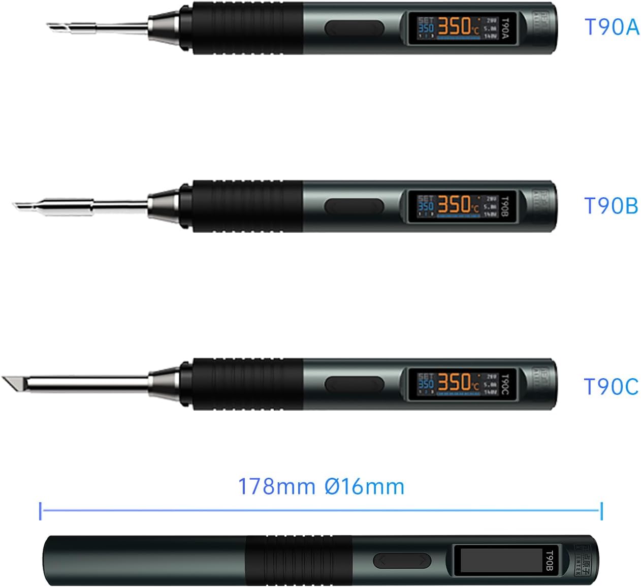 Name model: T90A/B/C Power supply interface: Type-C Working voltage: DC 9~28V Type-C fast charging protocol: PD3.1/QC3.0 Temperature control range: 80~450°C Heating power (adjustable): 18~140W Screen: 0.99' IPS LCD (160*60 Pixel) Overall size (including sleeve): L178mm Ø16mm Heating core model: T210/T245/T65 Heating core resistance: 2.1Ω/2.5Ω/6.0Ω Overall weight: 55g