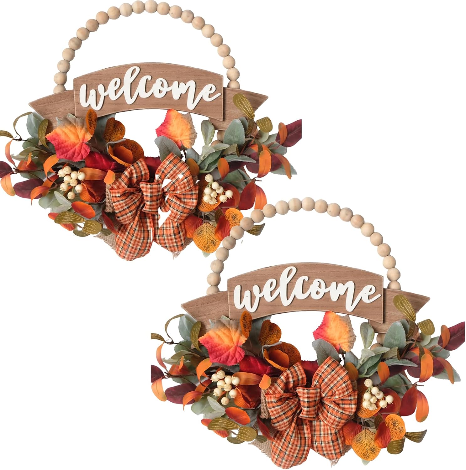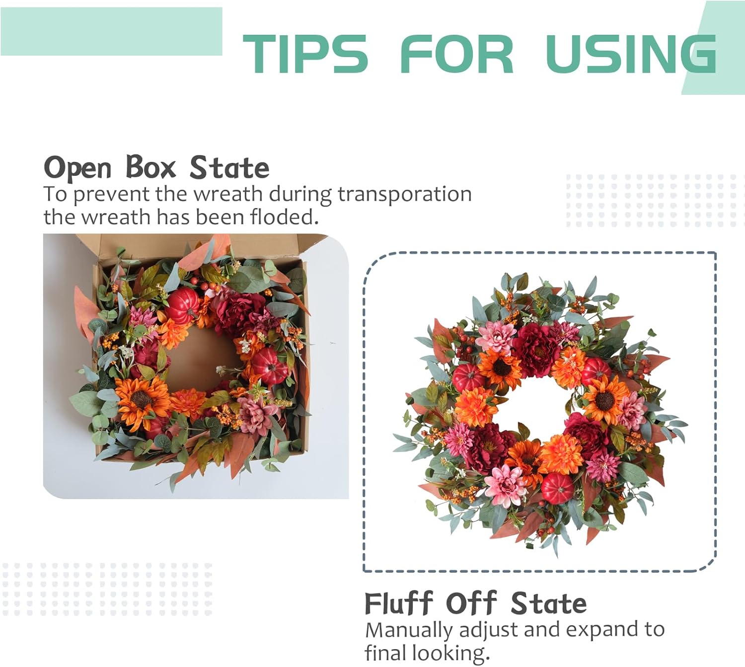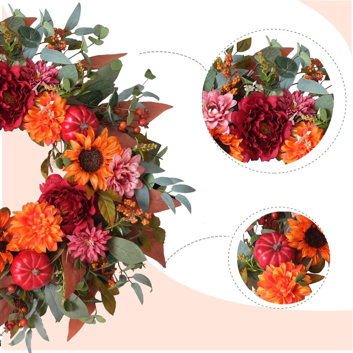 This fall front door wreath is full of the autumn colors and suitable for whole fall from the earlier to the end. The full eucalyptus and boxwood leaves make the wreath full of the life energy, and the top part, the life looking sunflower peony dahlia flower add color and elegant feeling. This wreath is a valuable fall home decor for choice. The outer diameter of this fall sunflower door wreath is about 24 inch, this size is suitable for decorating your front door, entry place, windows, walls, fire place, kitchen etc. This wreath is a good door decoration for this fall.