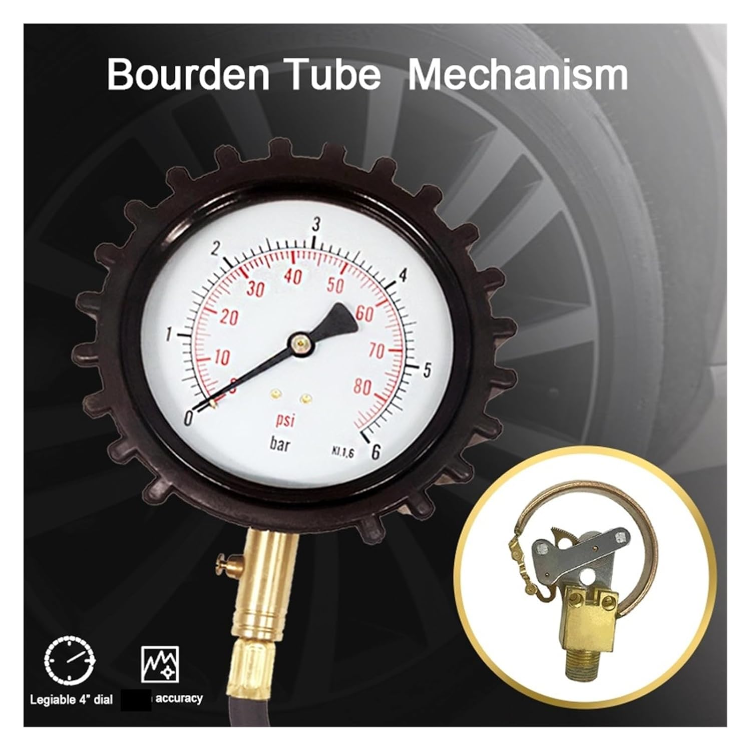 The 4-Inch Tire Pressure Gauge is built to deliver precise and effortless tire pressure checks for everyday drivers and professionals alike. Featuring a robust 200 PSI capacity, this gauge handles everything from standard car tires to high-pressure racing or truck tires with ease. The large 4-inch dial offers clear, glare-resistant readings, while the clip-on air chuck ensures a secure, no-leak connection to tire valves without requiring extra force or tools.Designed with a heavy-duty metal body and impact-resistant rubber bezel, this gauge withstands tough conditions, whether in your garage or on the road. Its high-accuracy analog movement (±1% tolerance) guarantees consistent and dependable measurements, helping you maintain tire pressure for improved , fuel efficiency, and tire longevity. for automotive enthusiasts, mechanics, and racers, this tool combines practicality with durability – making it a must-have addition to any vehicle maintenance kit.