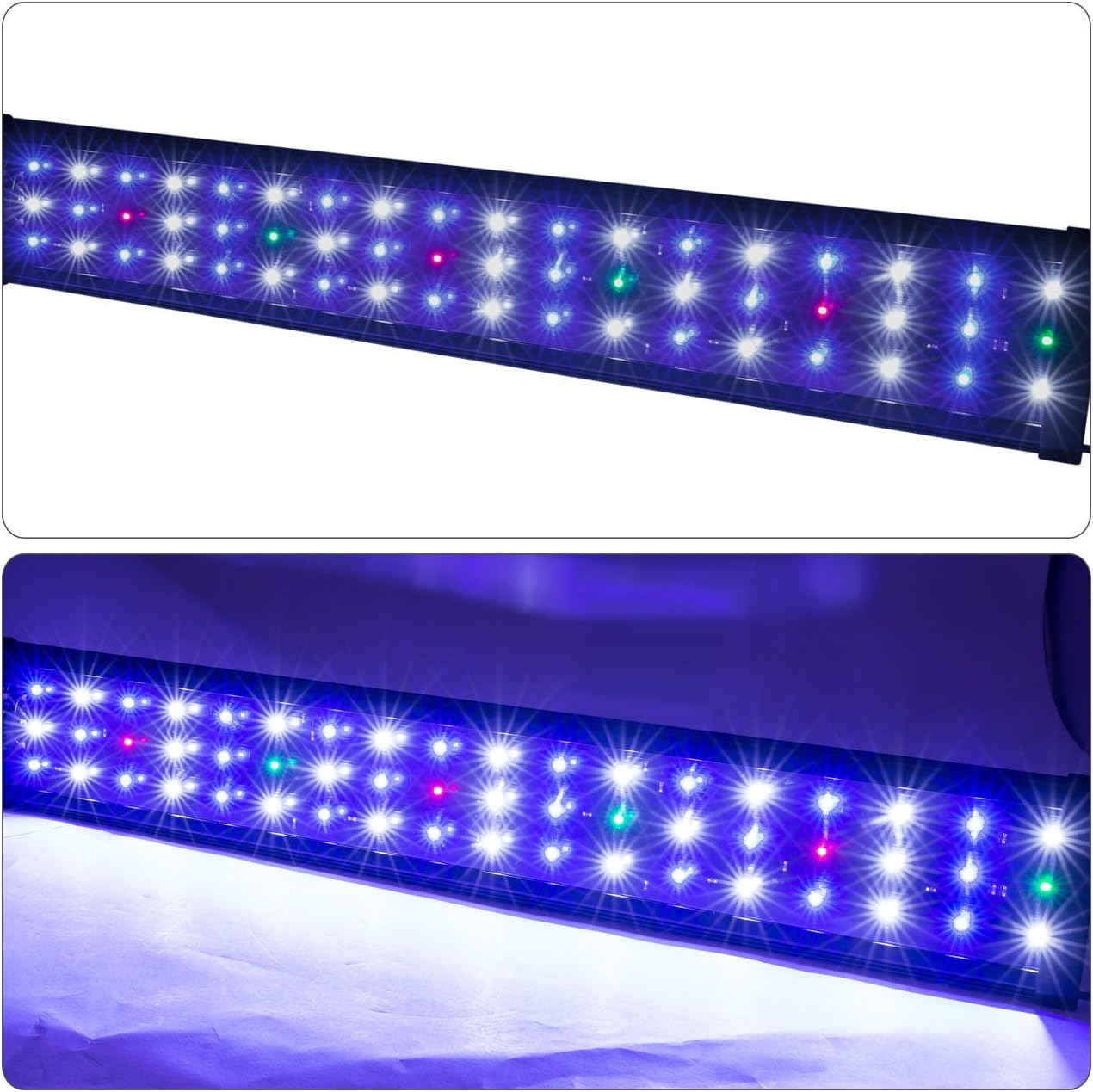 This upgraded colorful full spectrum 0.5W LED aquarium light with expendable brackets is great for your aquarium tanks. Not only does it help algaes grow more luxuriant, but it also enhances your aquatic plants to have more vivid color - adding even more ornamental value to your aquarium tanks.Features:54 LEDs with 4 Colors: Full-spectrum, super bright, energy efficient, and long lasting LEDs which produces an amazing vivid shimmer for your aquarium.Adjustable Mounting Legs: Extendable brackets allow for flexibility in fitting a variety of aquarium tanks with widths ranging from 30 inches to 42 inches.Durable Design: Constructed from an aluminum alloy shell for faster heat dissipation while providing a much more durable body than those made of plastic. High-quality LEDs can be used for at least 50,000 hours.Applications: Suitable for both freshwater or saltwater tanks, and low-to-high light level aquarium plants. It is strongly recommended to use over a glass aquarium cover or acrylic canopy top. Do not use over "open" water.3 Optional Lighting Modes: All LED Lights On.Only Blue LED Lights On.All Lights Off.Specifications:30" to 42" AquariumWhite LED - 24 Pieces (10000K 0.5W)Blue LED - 24 Pieces (460NM 0.5W)Red LED - 3 Pieces (625NM)Green LED - 3 Pieces (625NM)Lumen - 3420Extendable Bracker Length: 5 InchesSize Of Light: 27.8" x 4.5" x 0.5"