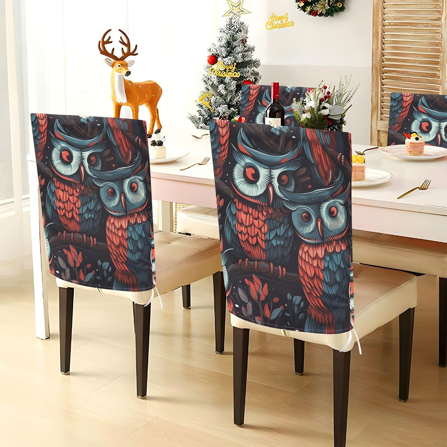 Chair Cover Material made of polyester,comfortable and soft to touch,reusable and suitable for long term use Features easy to install and remove, tie rope design at the bottom,machine washable Stylish Chair Decoration With beautiful pattern,it can be used for family party/ birthday party/wedding/ holiday party to add atmosphere, also can be used for chair decoration in living room, dorm, kitchen dining room,bedroom to bring protection to the chair while avoiding stains to dirty the chair back. Easy To Care Machine washable, Not washing with hot water, Not bleaching
