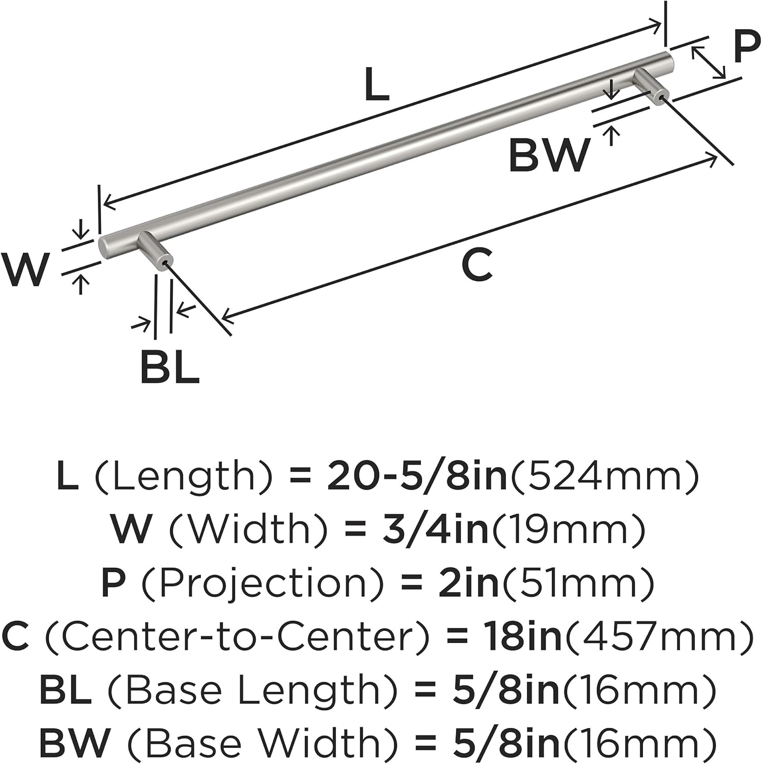 The Amerock BP54025CSG9 Bar Pulls 18 inch (457mm) Center-to-Center Appliance Pull is finished in Sterling Nickel. Modern functionality meets straightforward styling. The streamlined design of the Bar Pulls collection makes a statement with clean lines and smooth textures. Sterling Nickel is a cool, smooth and metallic silver-toned finish that is timeless and subtle. Founded in 1928, Amerock’s award-winning home solutions including decorative and functional cabinet hardware, bath accessories, decorative hooks and wall plates have built the company’s reputation for chic design accessories that inspire homeowners to express their personal style. Amerock offers a variety of styles and finishes at affordable prices that add the perfect finishing touch to any room.
