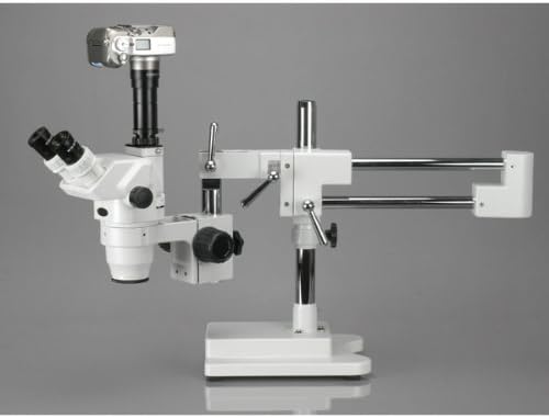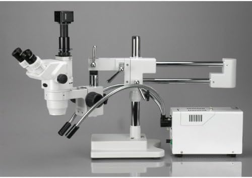 The AmScope ZM-4TV3 professional trinocular stereo zoom microscope has a pair of 10x and 20x extreme-widefield high-eyepoint eyepieces, a 0.67x-4.5x zoom objective, two Barlow lenses, and a double-arm boom stand. The microscope has an overall magnification range of 2x-180x. The trinocular viewing head has an interpupillary range of 55 to 75mm, a 45-degree inclination to reduce eye and neck strain, and 360-degree rotation to enable sharing. The vertical trinocular port can be used as a C-Mount or 23mm photo port (camera sold separately). The EW10x22mm and EW20x12mm extreme-widefield high-eyepoint eyepieces combine with the 0.67x-4.5x zoom objective to provide zoom magnification and a longer working distance for inspecting large-scale specimens that require handling or repair. The microscope comes with 0.3x and 2.0x Barlow lenses that can be added to the objective to increase the magnification range. A Barlow lens with a magnification of less than 1.0 reduces magnification and increases the working distance, while a Barlow lens with a magnification greater than 1.0 increases the magnification and reduces the working distance. High-eyepoint eyepieces ease viewing for users who wear glasses, and dioptric adjustment accommodates individual eye-strength differences. A stereo microscope, sometimes called an inspection or dissection microscope, has low magnification and a long working distance that enables users to manipulate the object being inspected. Ambient lighting illuminates the specimen, eliminating the need for power or batteries. The microscope has a double-arm boom stand that enables users to position the microscope head on all three axes (X, Y, and Z). The stand has 20" double arms, and a 30" overall length. Bilateral focus eases use for left- and right-handed users. The pillar is 17" and the focus rack has a 3" diameter. The solid cast-steel base is 2 x 8-1/4 x 10-1/4 inches (H x W x D, where H is height, the vertical distance from the lowest to highest point; W is width, the horizontal distance from left to right; D is depth, the horizontal distance from front to back).SpecificationsHeadTrinocularMagnification range2x-180xZoom objective power0.67x-4.5xEyepieces (DIN, 30mm)EW10x22mm and EW20x12mm high-eyepointOptical working distance14"Microscope standDouble-arm boom standHead movementX-, Y-, and Z-axesIllumination typeN/ALight sourceAmbientPowerN/AMicroscopes are instruments used to enhance the resolution of an object or image. Types include compound, stereo, or digital. Compound microscopes use a compound optical system with an objective lens and an eyepiece. Stereo microscopes show object depth in a three-dimensional image. Digital microscopes are used to display an image on a monitor, rather than looking through a lens. Microscopes can have monocular (one), binocular (two), or trinocular (three) eyepieces, with varying magnification abilities. Magnification ability refers to the size of an image. Resolution, also known as resolvant power, refers to the clarity of the image. The interaction between field of view (FOV), numerical aperture (NA), and working distance (WD) determines resolution. Microscopes can control magnification through a fixed focus, or through a range of adjustments. They can also utilize LED, fluorescent, and mirror light sources to help control viewing capabilities. Microscopes are widely used in education, lab research, biology, metallurgy, engineering, chemistry, manufacturing, and in the medical, forensic science, and veterinary industries.United Scope manufactures microscopy equipment and accessories under the brand name AmScope. The company, founded in 1996, is headquartered in Irvine, CA.What's in the Box?AmScope ZM-4TV3 stereo zoom microscope with double-arm boom standEW10x22mm eyepieces, 30mm, one pairEW20x12mm eyepieces, 30mm, one pair0.67x-4.5x zoom objective0.3x Barlow lens2.0x Barlow lensFocus rackEye guards, one pairStage clips, one pair