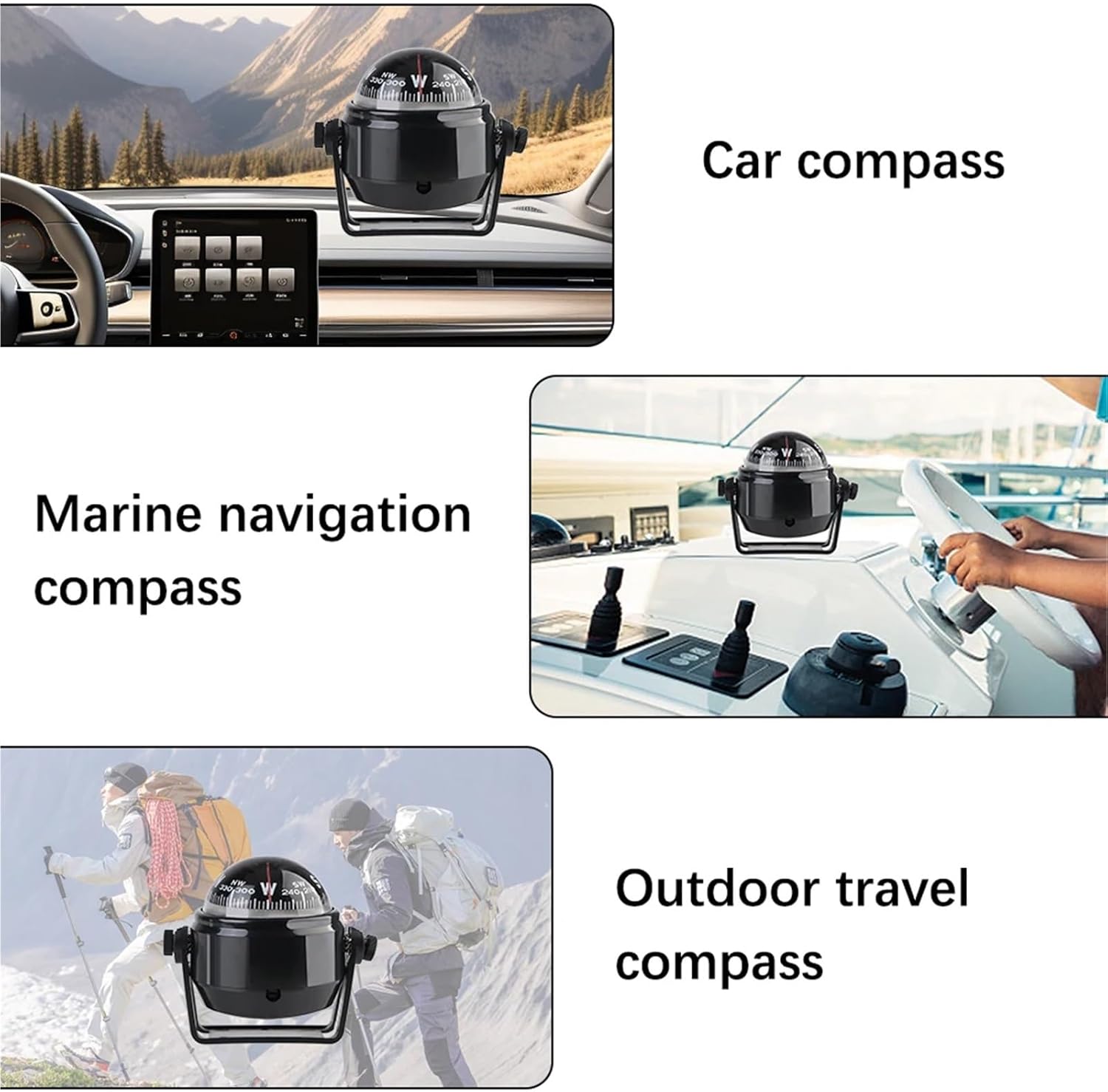 Features:Pivoting compassVariable Mounting Bracket , Variable Sun VisorCorrosion Resistant , Waterproof, durable and long lastingBuilt in Accuracy compensators Windshield or Dash MountCompass with Mounting screw slot , 5 degree graduationsMulti-function Compass, Magnetic Declination adjustmentSpecification:Auxiliary Materials:MetalProduct features:CompassProduct features:The product is lightweight and easy to carry, making it a great helper for travel and camping in the wilderness