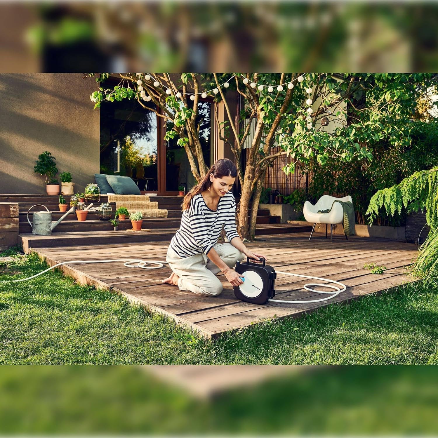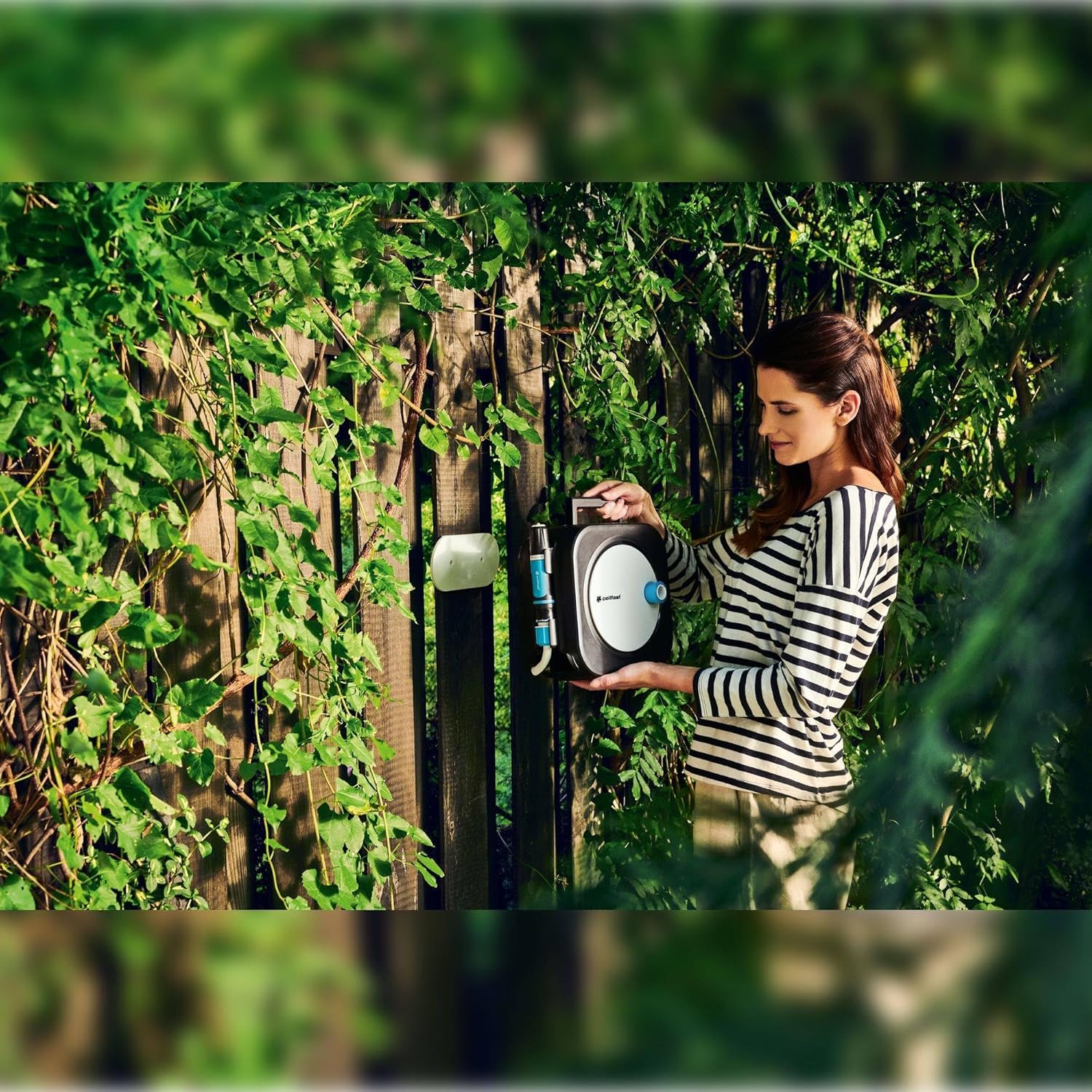 Compact, lightweight and durable folding handle ensures convenient transportation. Profiled rotation crank handle facilitates winding the hose, holders for sprinklers and connectors situated on both sides of the reel, hanger included in the set, it enables hanging the reel on a wall. Dimensions: 315 × 160 × 260 mm