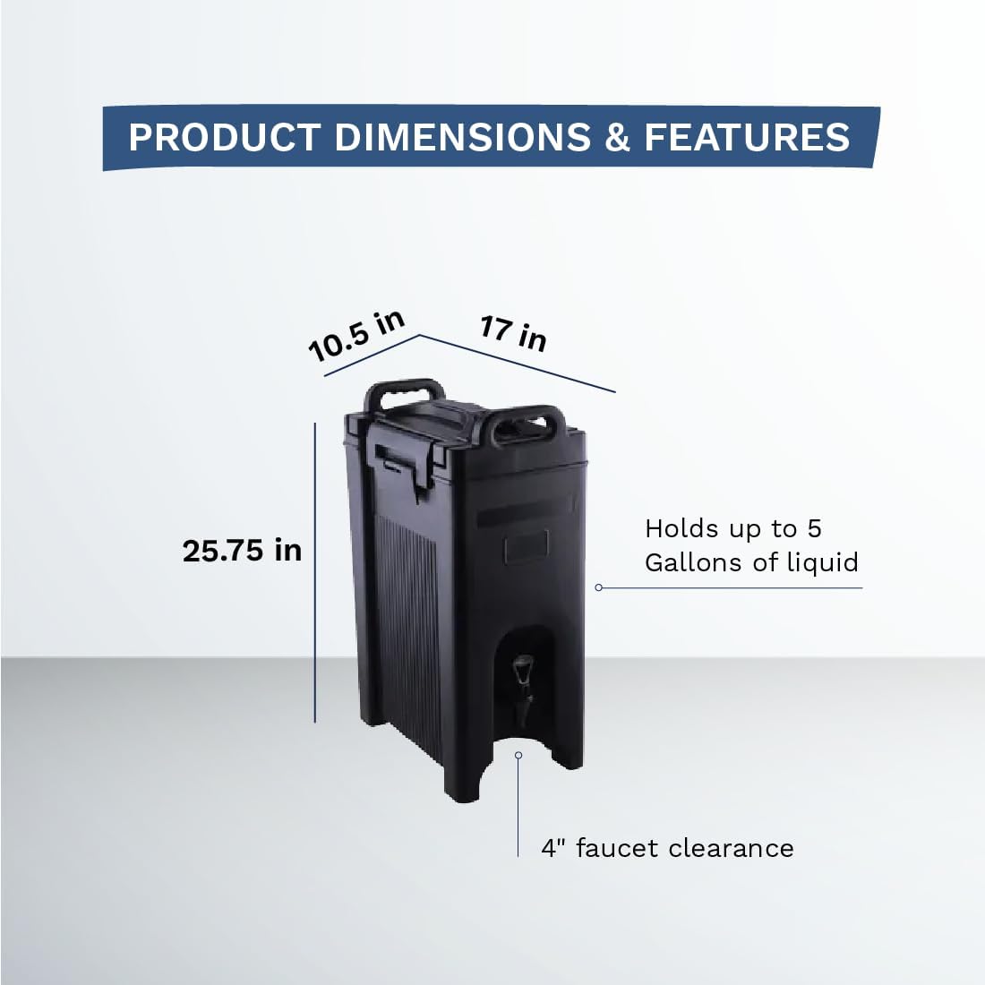 The CenPro Insulated Beverage Dispenser is an affordable beverage serving solution that holds up to five gallons of hot or cold beverages, keeping them at serving temperature for up to seven hours. The durable polyethylene construction stands up to continuous use and transport, and the faucet design prevents dripping. This CenPro beverage dispenser is NSF certified, meeting key sanitation and safety standards for use in commercial foodservice environments.Main Features of the CenPro 29A-001 Beverage Dispenser Include:Insulated, capable of holding hot or cold beverages at temperature for up to seven hoursSecure lid with oversize latches prevents leaking4" faucet clearanceFaucet design prevents drippingFive gallon capacityDurable polyethylene construction holds up to constant and transport10-1/2"Wx17"Dx29-3/4"HWeighs 14 lbsBlackNSF listed