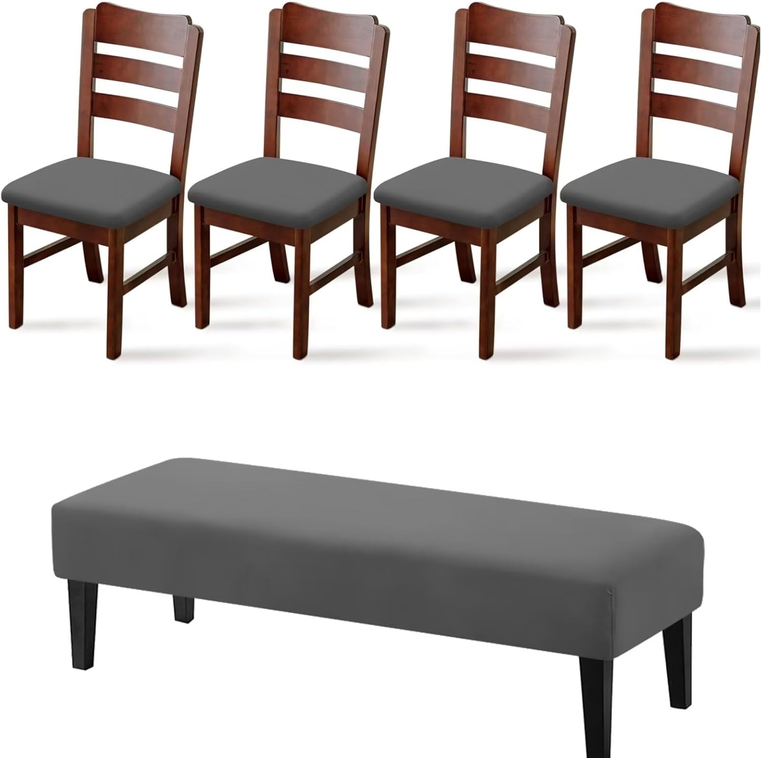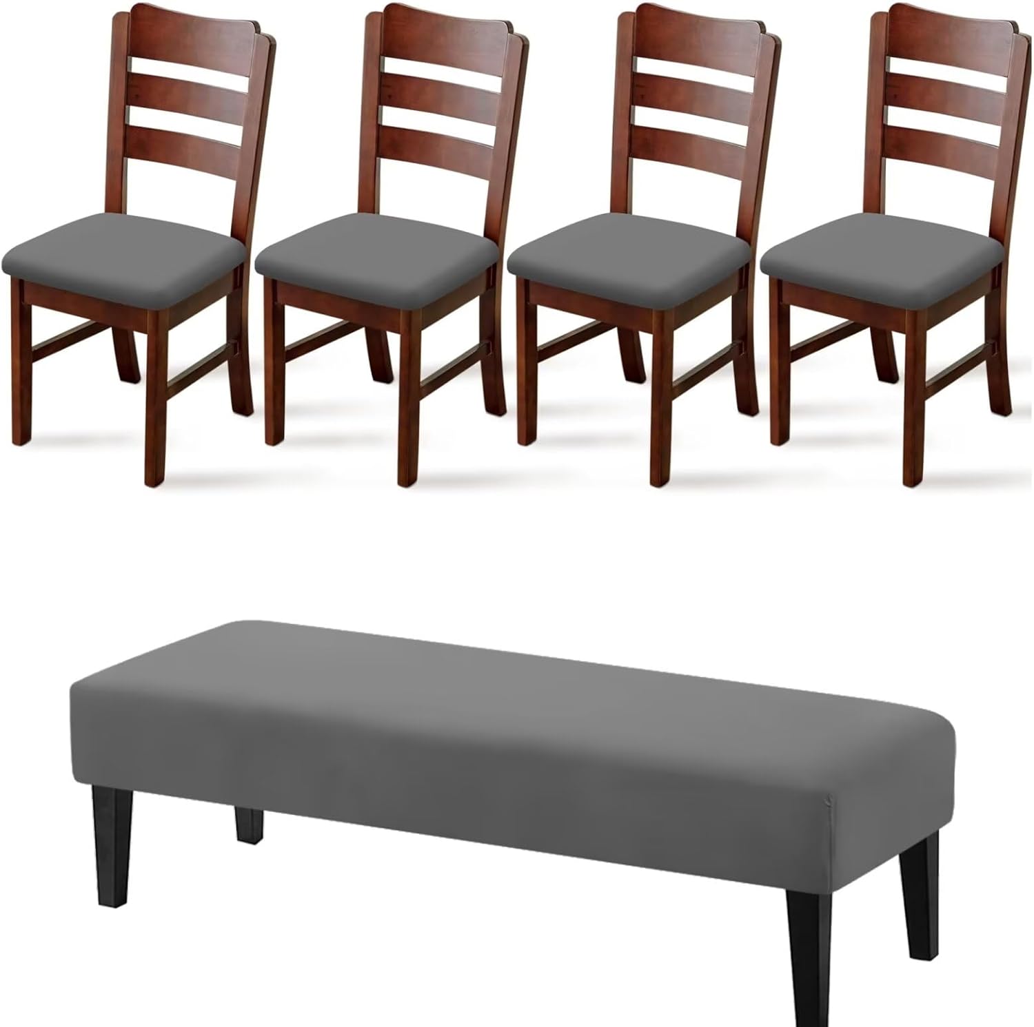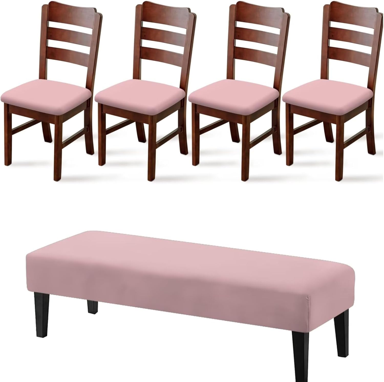 Transform your dining space with FANCOSAN's elegant 5-piece slipcover set, designed to breathe new life into your furniture while providing practical everyday protection. Crafted from a premium blend of 92% polyester and 8% spandex, these slipcovers offer a soft, comfortable feel with just the right amount of stretch. They maintain their shape over time, ensuring lasting durability and a consistently neat appearance that enhances your room’s aesthetic. This versatile set includes four dining chair seat covers and one bench cover, available in a variety of colors to complement your personal style and home decor. Whether you’re updating worn chairs or simply refreshing your space, these slipcovers provide an instant makeover, giving your old or damaged furniture a brand-new look without the need for replacement. Designed for a universal fit, the chair covers accommodate standard chairs. For an optimal fit, we recommend measuring your furniture before ordering to ensure the best possible fit. Ideal for Christmas dinners, holiday parties, and themed celebrations, these stylish covers add a warm, cozy touch to any occasion. Beyond their decorative appeal, they serve a practical purpose by safeguarding your chairs from stains, dirt, and pet damage. Perfect for households with children, dogs, or cats, they seamlessly combine style with durability, keeping your furniture looking pristine. Care and maintenance are effortless. Both the chair and bench covers are machine washable. For best results, wash them separately in cold water on a gentle cycle and avoid using bleach. Tumble dry on a low setting, and no ironing is required. This easy-care design ensures your slipcovers remain fresh and beautiful with minimal effor.