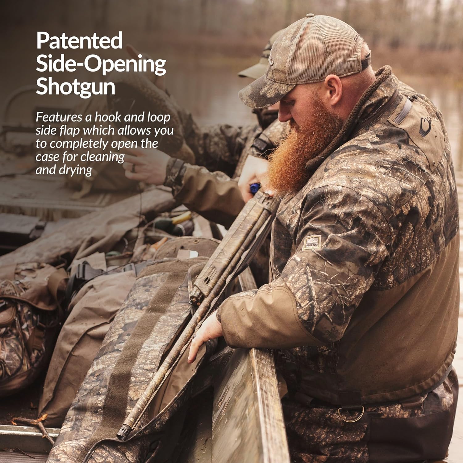 DRAKE WATERFOWL SIDE OPENING GUN CASE This unique, patented shotgun case features a hook and loop side flap which allows you to completely open the case for cleaning and drying. The exterior fabric is our rugged HD2 material, and the interior is lined with nylon to resist water absorption and speed cleaning and drying. It also features an outer accessory pocket for choke tubes. This gun case has a built-in top carry handle and a fully adjustable padded shoulder strap. Accommodates shotguns up to 52"" overall length. With a unique floating shotgun case design, the Drake Waterfowl® Systems Side-Opening Floating Gun Case gives you quick access and moisture management. Quick access design features a zipperless side flap, which allows you to completely open the case for cleaning and to allow moisture to evaporate. Case closes securely with hook 'n' loop closure and heavy-duty snaps. MATERIALS - Rugged HD2 material, Nylon interior liner.FEATURES - Adjustable strap with HD2 shoulder pad, Top carry handle, Quick-top hook & loop opening, Heavy duty snaps, Choke tube outer pocket. PRODUCT CARE: Machine wash cold using a detergent designed for hunters or baking soda Do not bleach Do not machine dry, as excessive heat will damage the waterproof laminate Hang to dry Do not iron Wipe with damp cloth to remove mud and other stains as often as possible to maintain maximum breathability