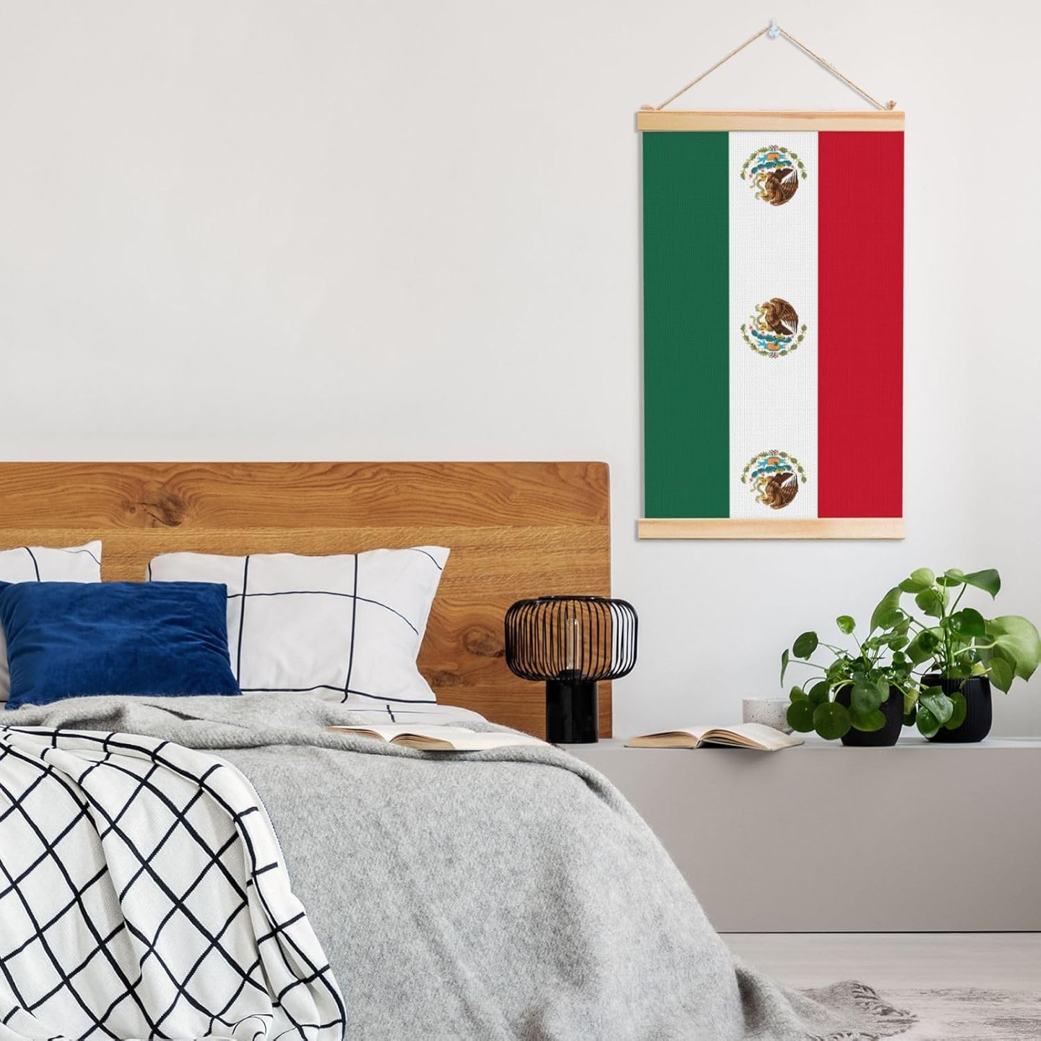 Our Flag Of Mexico Print Wooden Poster Hanger Is An Excellent Addition To Your Home Decor Or A Perfect Gift For Friends And Family. Made Of Selected Quality Canvas With Brilliant And Enduring Colors, This Wall Art Is Designed To Resist Water, Dust, And Fading, Ensuring The Bright And Vibrant Art Lasts. The Polyester Is Enclosed Between Two Teak Wood Hanger Scrolls With An Attached 35cm Rope For Easy Hanging. Installation Is Made Simple With The Included Two Nails In A Plastic Box. The Modern Minimalist Style Of Our Wall Hanging Complements Any Home Decor, Elevating The Artistic Ambiance And Brightening Up The Room. Experience The Elegant Transformation This Wall Hanging Scroll Painting Brings To Your Spaces Today.