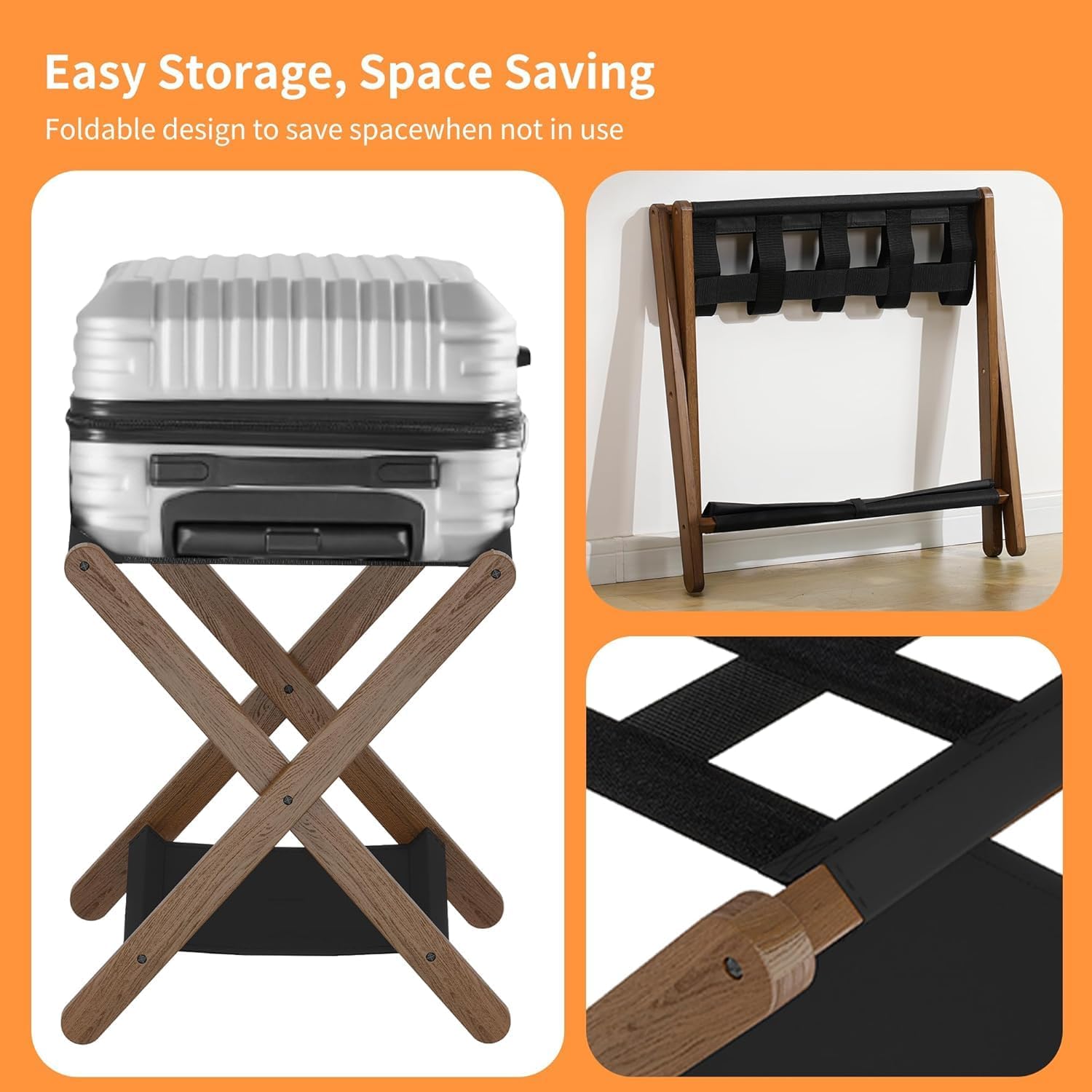 Elevate your bedroom or hotel guest room with this foldable luggage rack featuring convenient storage shelves. Crafted from rich walnut wood, this luggage stand combines timeless style with practical functionality, making it a sophisticated addition to any space. The rack comes equipped with 5 durable nylon straps that securely hold your luggage in place, preventing slipping and keeping your bags stable while you pack or unpack. The integrated storage shelves provide extra space for folded clothes, accessories, or travel essentials, helping you stay organized during your stay. When not in use, the rack folds flat for easy storage, saving valuable floor space in smaller rooms. The warm walnut wood finish adds a touch of elegance that complements a wide range of interior styles, from classic to contemporary. Whether you are outfitting a hotel room or upgrading your home bedroom, this luggage rack is a practical and stylish solution for travelers and hosts alike.
