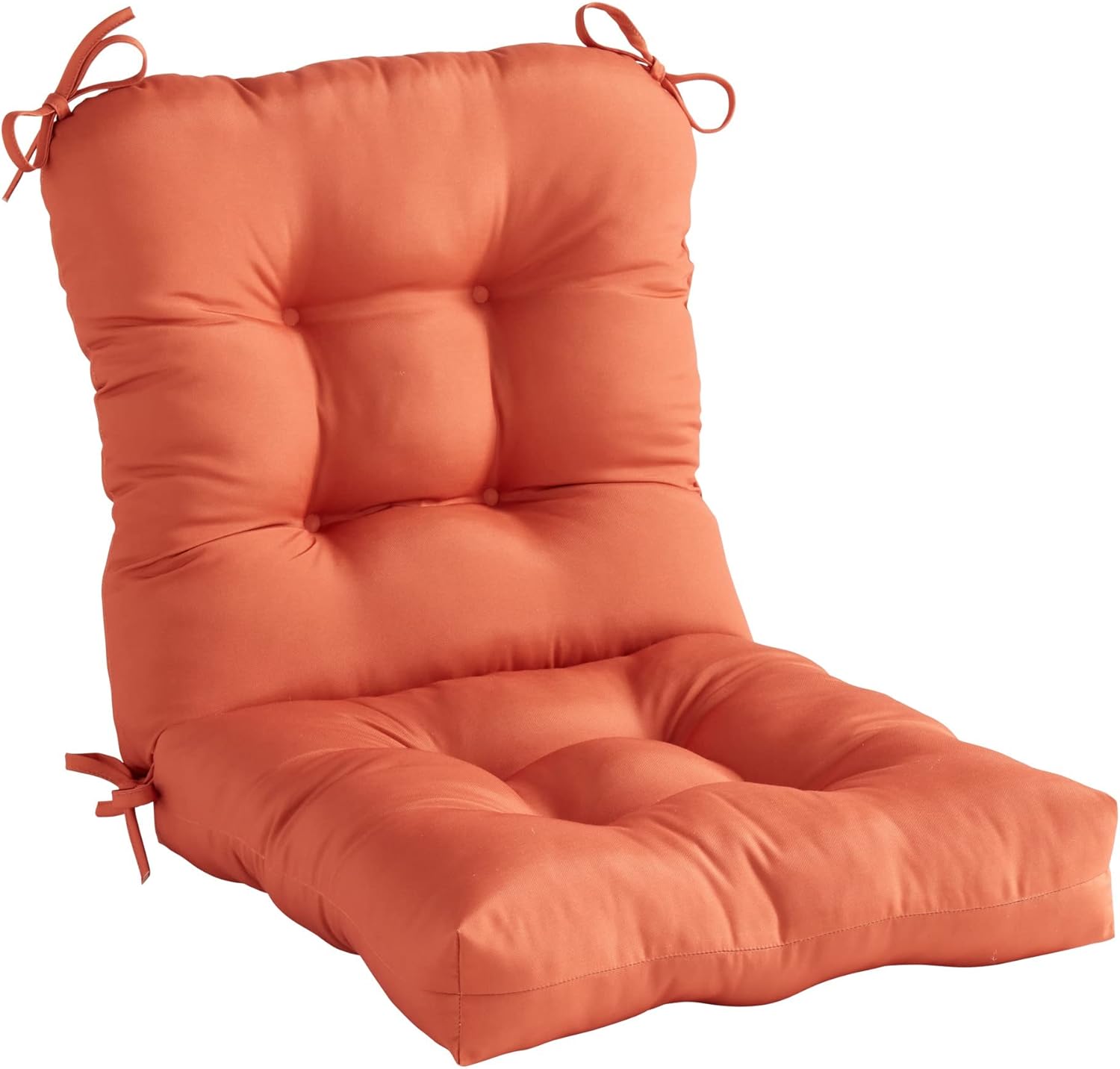 This Greendale Home Fashions Outdoor Seat/Back Combination Chair Cushion is the perfect complement to your outdoor furniture. It measures 42 x 21 x 5 inches, and comes with four string ties which allow for a secure attachment to outdoor chairs. Eight circle tacks give the cushion dimension and a full appearance, while preventing cushion fill from shifting and increasing durability. The cushion's durable polyester fabric holds up to the outdoor elements so your cushions stay looking great. The cushion's polyfiber fill is made from 100% recycled, post-consumer plastic bottles, and overstuffed for added comfort, strength and durability. A variety of colors and prints are available to enhance your outdoor decor.Please measure your cushions before purchase to ensure a proper fit.Please Note: Cushion dimensions can be +/- 2 inches. Product will arrive in a slightly compressed state; please allow a few days for product to expand to final size listed in description.In an effort to reduce waste, your cushions will arrive in a recyclable box with no additional plastic waste.For best results, and to extend the life of your cushions we recommend storing them covered when not in use.