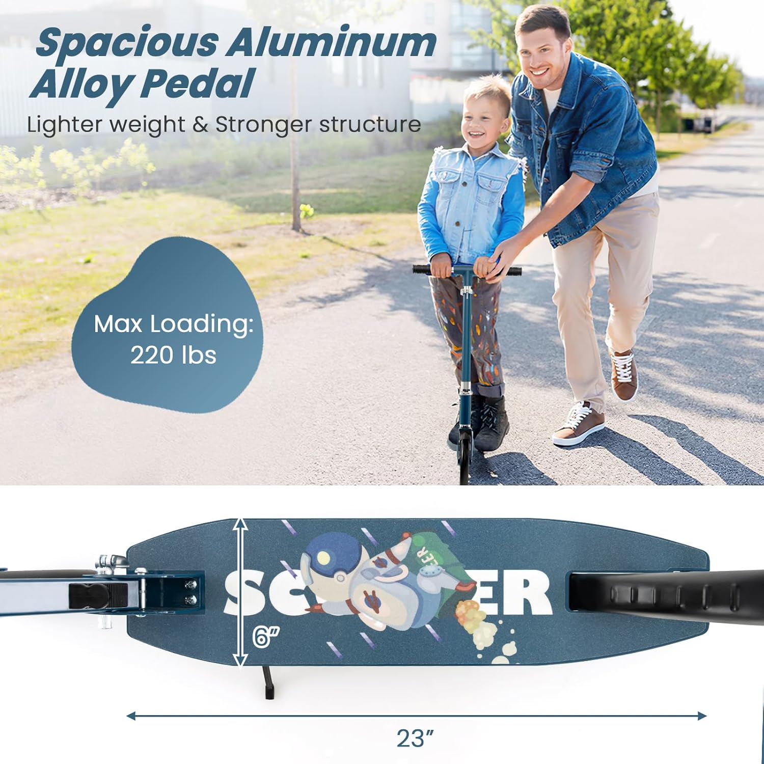 Description:Built for Performance, Designed for ConvenienceEngineered for urban commuters and college students, the GYMAX kick scooter combines industrial-strength construction with user-friendly features. The aluminum pedal distributes weight evenly, while the shock-absorbing PU wheels deliver a car-like ride on uneven surfaces.Smart PortabilityUnlike bulky scooters, our patented folding mechanism collapses in seconds without tools. The integrated kickstand allows freestanding storage at cafes or subway stations, and the lightweight frame slides effortlessly into backpack compartments.Growth-Friendly DesignParents love the adjustable handlebar that grows with kids from age 8 to adulthood. The rust-resistant coating ensures years of use in rainy climates.Features:✔ Military-Grade Durability: Reinforced steel handlebar + aluminum alloy pedal with ABEC-7 bearings withstands 220lbs and harsh landings.✔ 3-Second Folding: Tool-free clamp lock system folds compactly (9lbs) for storage in trunks/offices.✔ Triple-Height Adjustment: 36"/37.5"/39" handlebar with click-pin lock fits teens to 6' adults.✔ 8" All-Terrain Wheels: PU wheels absorb shock on pavement, gravel, and campus paths.✔ Safe & Smooth Ride: Non-slip rubber grips + rear footbrake ensures easy controlSpecification:Material: Aluminum Alloy, Metal, TPR, PU, PPUnfolded Dimension: 36” x 15.5” x 36”/37.5”/39” (L x W x H)Unfolded Dimension: 31.5” x 15.5” x 12.5” (L x W x H)Deck Dimension: 23” x 6” (L x W)Adjustable Height: 36”, 37.5”, 39”Maximum Weight: 220 lbsRecommended Age: 8 + Years OldNet Weight: 9 lbs