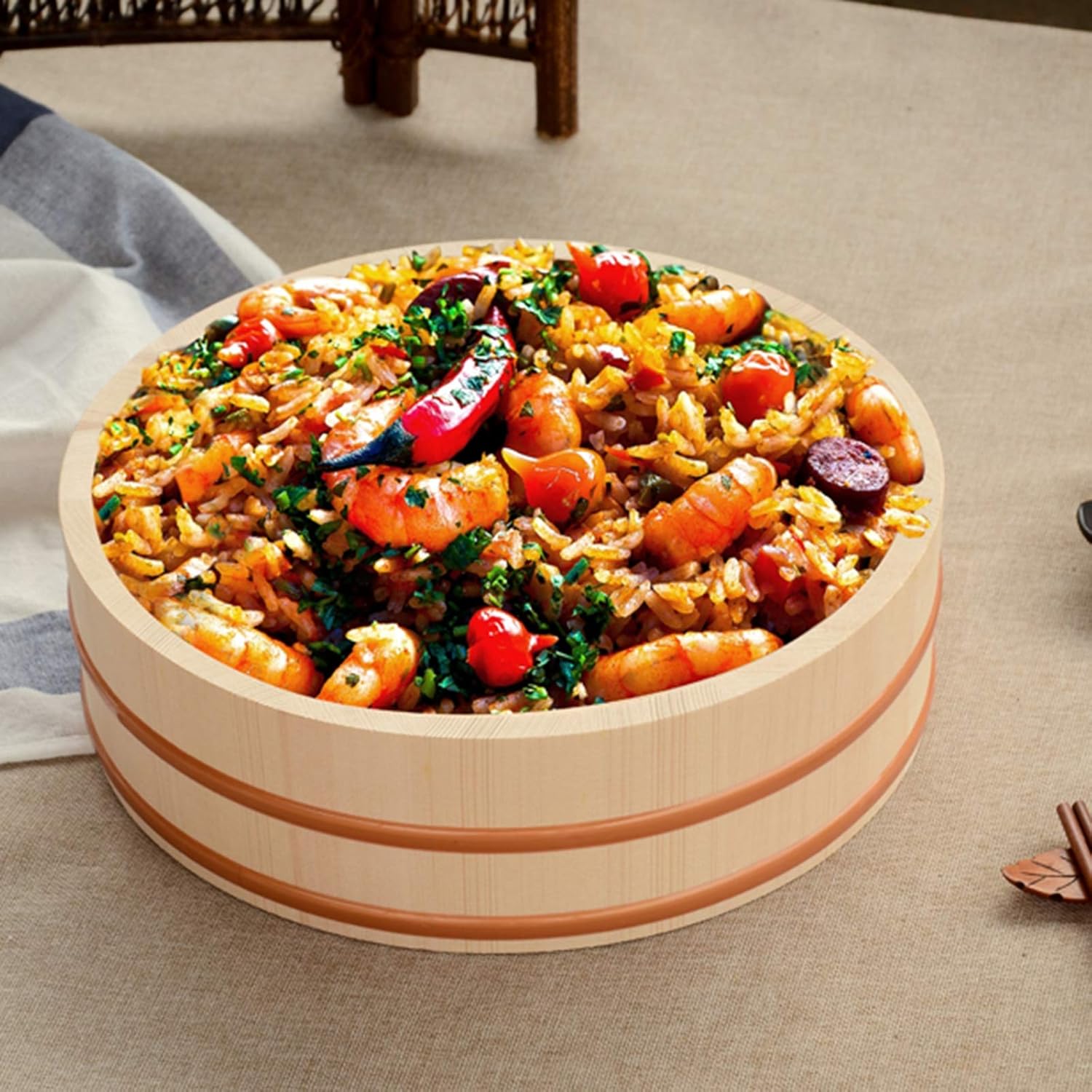 Description: Wooden Mixing Tub made of high quality material, durable and practical for long lasting use, suitable for home, kitchen, restaurant etc, it not only can be used as a rice mix bucket, but also can be used as a Sushi bucket. Importance: It is traditionally used when making sushi rice. It is important to use a non-metallic container because this prevents any interaction between the rice vinegar which will be added to the rice and any metallic material. The wood also serves to absorb excess moisture from the cooked rice and the large mixing surface allows the hot rice to cool rapidly. Specification: -Color: Wood Color -Material: White Pine Wood + Copper Bands -Technology:Color Glaze -Shape:Round How To Care? 1. Because the wood itself will expand and contract with heat, it should not be directly exposed to the sun or exposed to cold wind. If it is not used for a long time for more than 2 months, the sushi barrel can be soaked and sealed with a large plastic bag to prevent the air from taking away moisture; 2. It is best to put a little water in it at ordinary times to make it absorb water and keep the wood saturated and moist; 3. If the sushi barrel has been filled with meat or oily food, use a trace detergent and hot water to scrub it; 4. Pack raw and cooked food separately to avoid cross-growing food bacteria. Package List: 1 x Wooden Sushi Rice Bowl