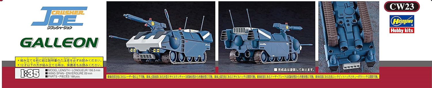1:35 Crusher Joe Galleon Category : Space AFV (Animation) Box size : Same size as HC41 (200 x 350 x 75) Estimated No. of parts : 188 Base kit : New Tool - Regular item in 2021 Model size : L : 196.5 mm x W : 89 mm Kit features : It is appeared on very popular Japanese animation "CRUSHER JOE".