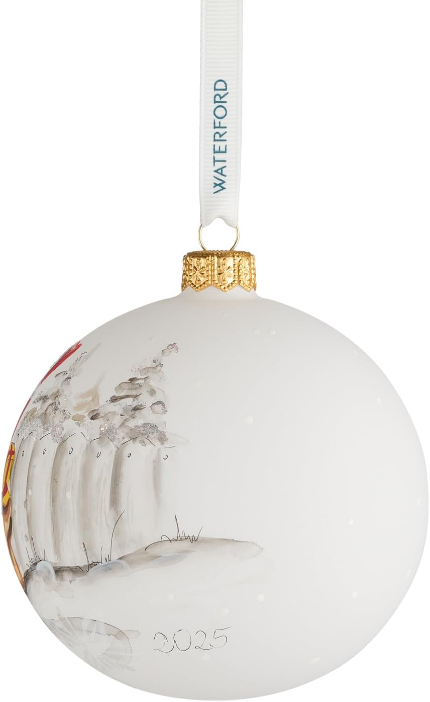 The Holiday Heirlooms Magic of Christmas Ornament captures the essence of the season with a charming hand-painted design of Santa tying a scarf around a snowman. Embellished with glitter accents, this bauble is crafted by skilled European artisans for a festive sparkle. Packaged in a Waterford-branded Fjord box with a clear lid and strung with a white branded grosgrain ribbon, it’s a timeless holiday decoration.