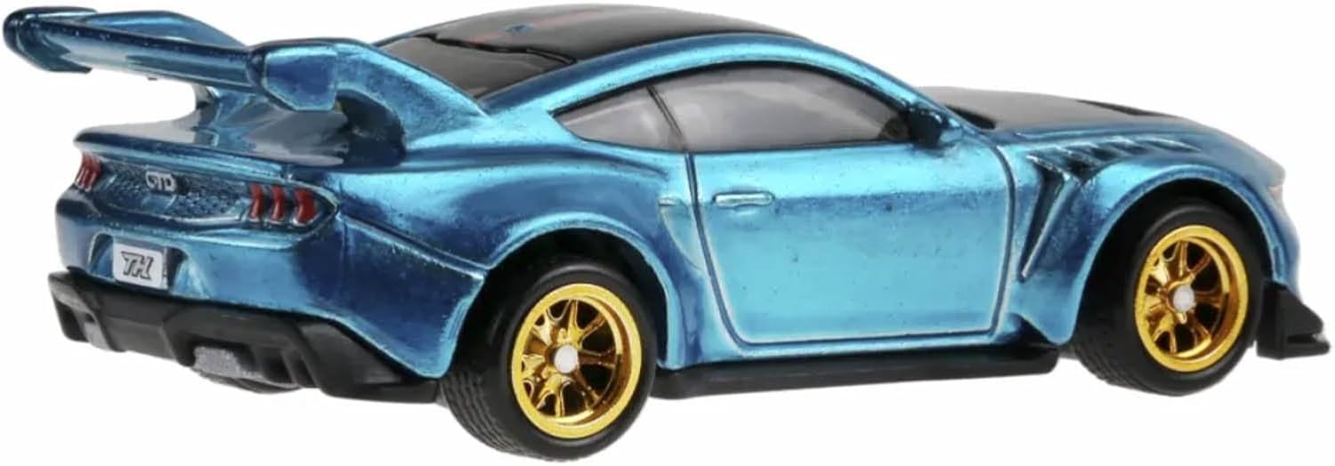 Introducing the Hot Wheels Factory Fresh Ford Mustang GTD, a stunning 1:64 scale die-cast replica that's sure to excite collectors and car enthusiasts alike. This Super Treasure Hunt edition features eye-catching Spectraflame metallic turquoise paint and distinctive gold wheels that make it stand out in any collection. Part of the Factory Fresh series (3/5), this model captures the aggressive styling and modern design elements of the real Ford Mustang GTD with impressive attention to detail. The premium finish and exceptional craftsmanship are evident in every aspect, from the carefully molded body lines to the detailed interior features. This collectible comes securely packaged in Hot Wheels' signature blister pack, perfect for both display and preservation. Whether you're a dedicated Hot Wheels collector, Ford enthusiast, or simply appreciate beautifully crafted die-cast models, this rare Super Treasure Hunt variant is a must-have addition to your collection.