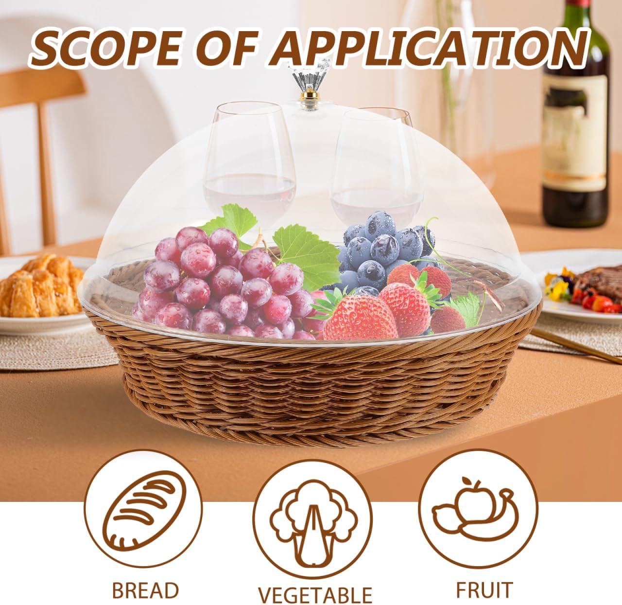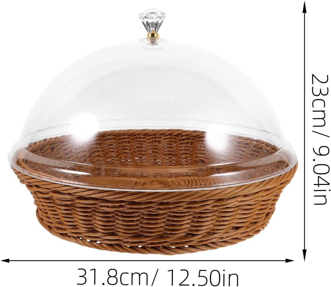 DescriptionThe versatile and stylish basket that is for storing or displaying baked bread, homemade pastries, fruits, vegetables, candies, cookies, small snacks, and pastries. The transparent lid is for protecting items and allows you to easily see the contents inside. Features๐๐ญ๐ฅ๐ฅ๐๐ฅจ๐ฅฏ- Color:Brown๐๐ญ๐ฅ๐ฅ๐๐ฅจ๐ฅฏ-Material:Acrylic, PP๐๐ญ๐ฅ๐ฅ๐๐ฅจ๐ฅฏ- Size: 31.80X31.80X23.00cm/12.50X12.50X9.04in - The storage basket is suitable for home, bakery, cake shop, food store, office, shopping mall, etc.- This storage basket can be used to store snack, fruit, vegetable, dessert, etc, and has a wide application.- Round and smooth surface, the storage basket is easy to wash and clean, time-saving and effortless.- As a practical storage container, is suitable as a food serving basket or sundries basket.- Versatile and practical, this basket is suitable for both special occasions and everyday use. Package Including1 x basket1 x lid