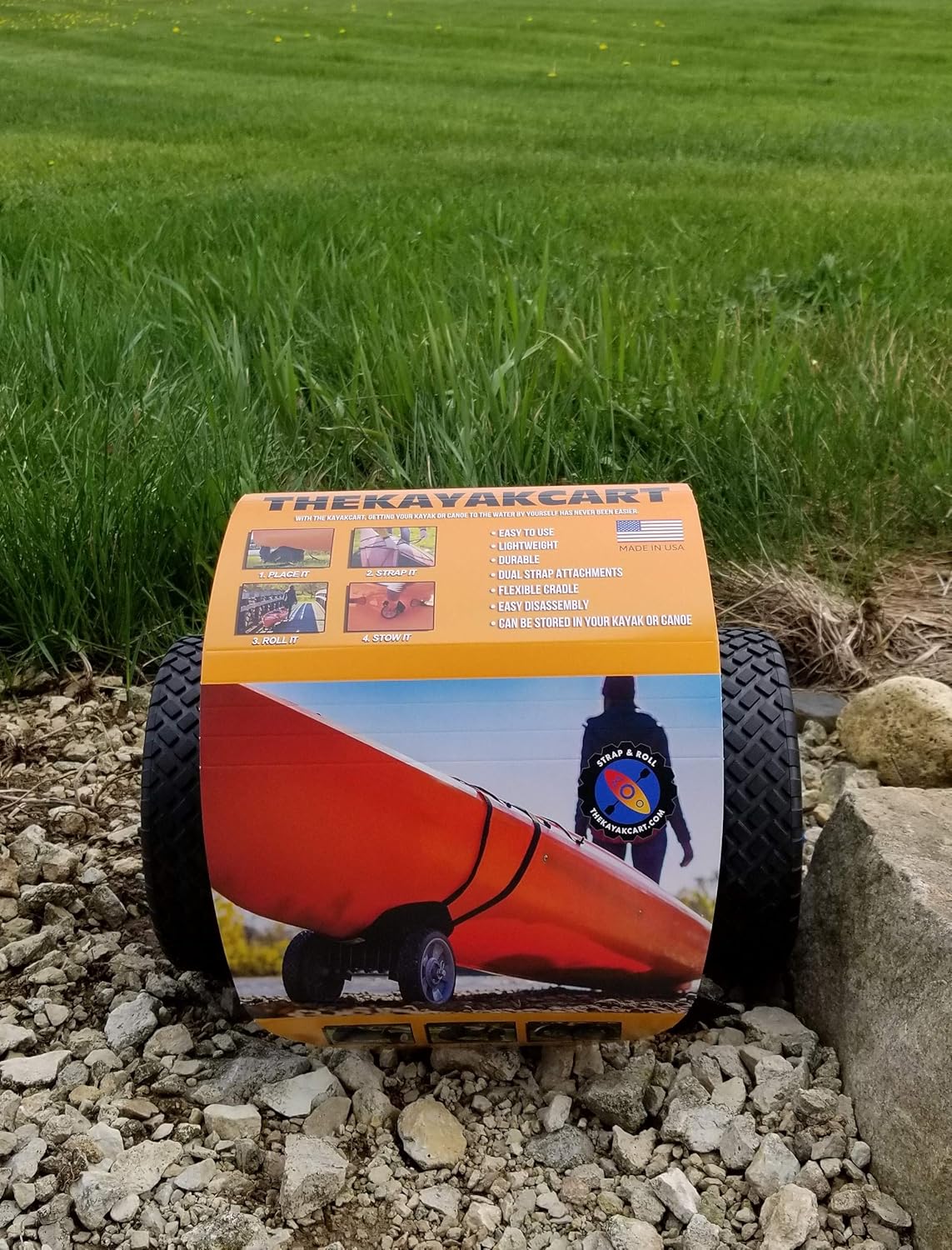 With TheKayakCart, getting your kayak or canoe to the water by yourself has never been easier. Just strap, roll, and launch! Durably designed and engineered for kayak, canoe, or rowing shell, the Kayak Cart can be quickly, easily, and securely attached in minutes to any shaped bow or stern. And the Kayak Cart’s three optional wheel types gives you the ability to traverse any terrain, including soft sand. Lightweight and compact. TheKayakCart KC-7 comes fully assembled and can be easily stored in your kayak or canoe, giving you complete paddle-boating freedom. ***NOT INTENDED FOR SIT ON OR FISHING KAYAKS ONLY INTENDED FOR SIT IN RECRATIONAL KAYAKS, CANOES, ROWING SHELLS & SKIFFS.