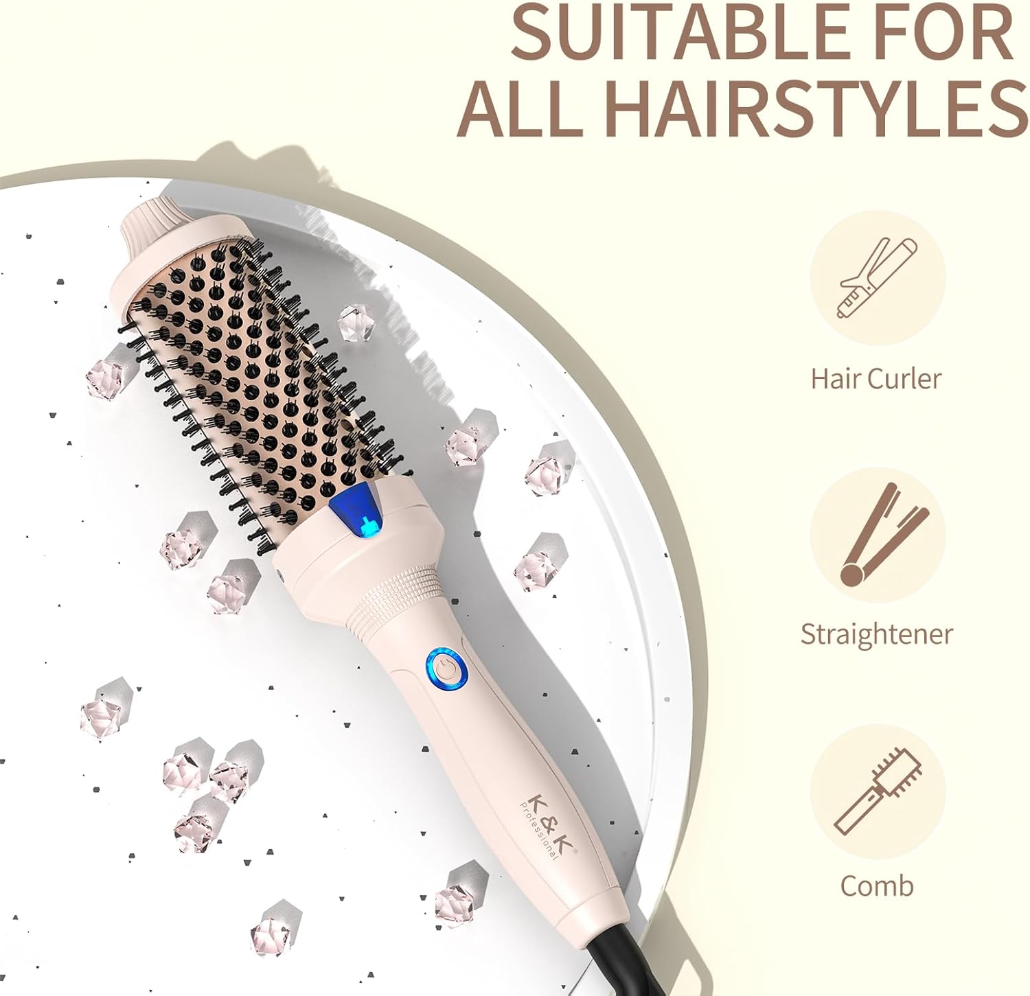 1. Plug in the K&K Thermal Brush and wait for it to heat up. 2. Select your desired temperature setting using the LED digital display. 3. Use the brush to glide through your hair, starting from the roots and moving down to the ends. 4. For curling, wrap sections of your hair around the brush and hold for a few seconds before releasing. 5. Use the cold broad comb teeth to help set the style. 6. Unplug the brush when you are done using it.