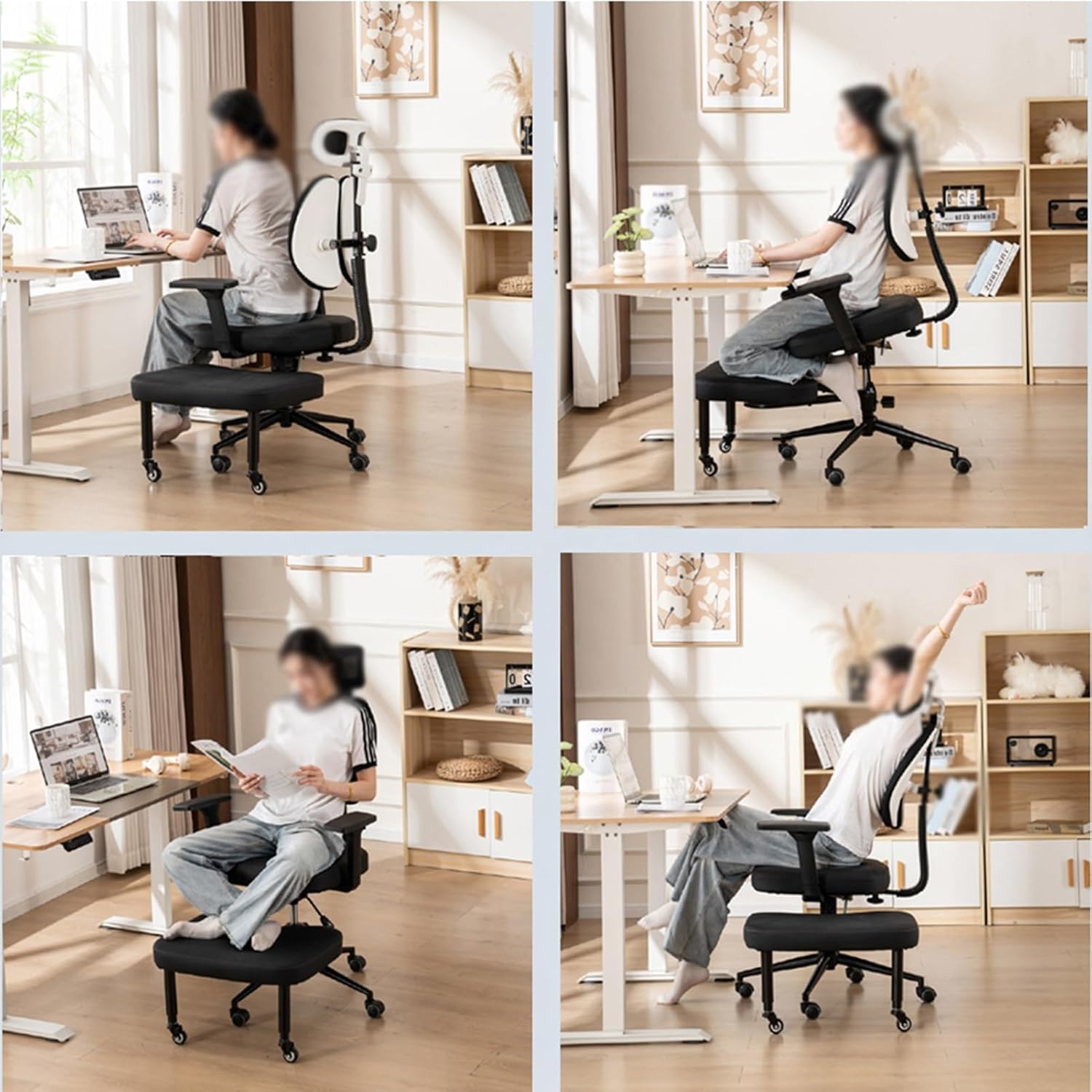 Ergonomic Comfort and Posture SupportFeaturing a supportive backrest,this kneeling chair delivers full-body relief by reducing strain your back, knees, and calves. It encourages an upright, open-hip posture and makes long hours of work or study more comfortable and productiveFeatures:1. kneeling chair can help correct incorrect sitting posture2. With backrest, provides good lumbar support3. Height adjustment of the headrest and armrests for added comfort4. 360° silent wheels for smooth and silent movement5. The rocking base provides improved balance and safeguards against rolloverSpecifications:Product Name: Kneeling Chair/Ergonomic Kneeling Chair/Posture Chair/Kneeling Desk ChairColor: BlackMade of: Steel, Sponge,leatherSize: As shown in the pictureWeight Capacity: 330 lbsSuitable for: home, office, classroom, or anywherePackage Includes:1 x Kneeling Chair1 x User GuideNote:1. Due to manual measurement, please allow 1-2cm deviation in dimensions2.The reason of computer resolution, there may be differences in color to the actual goods received, prevail
