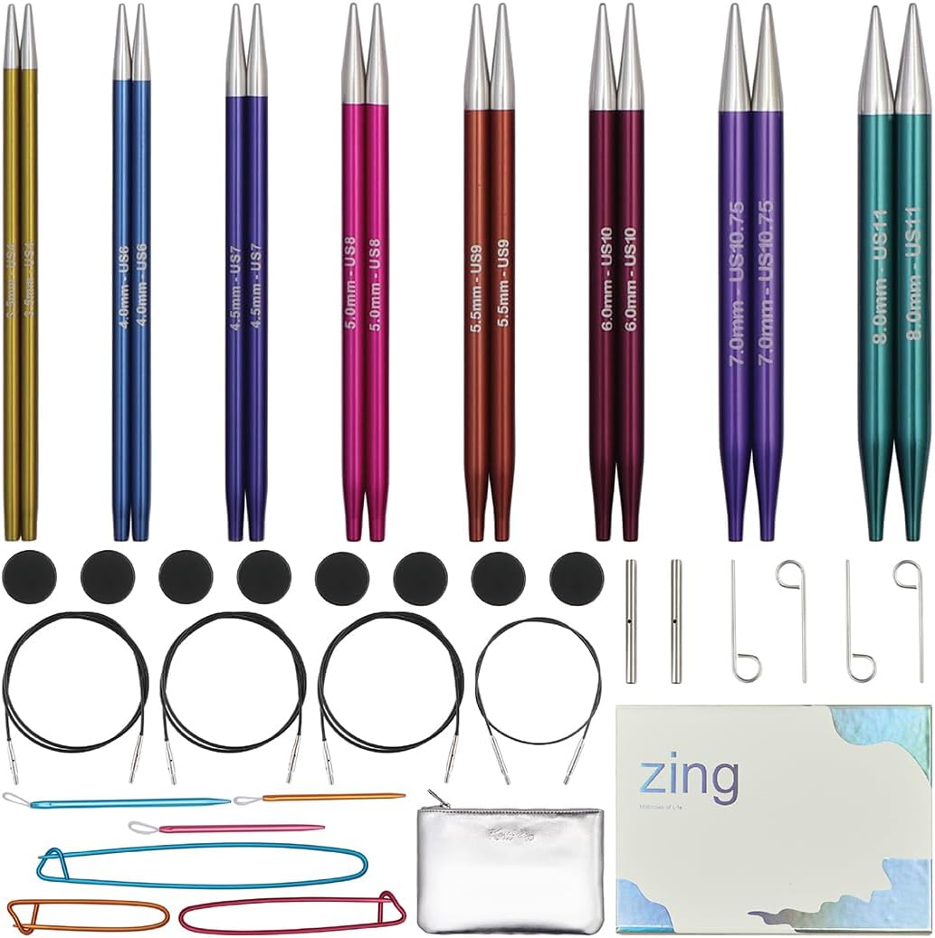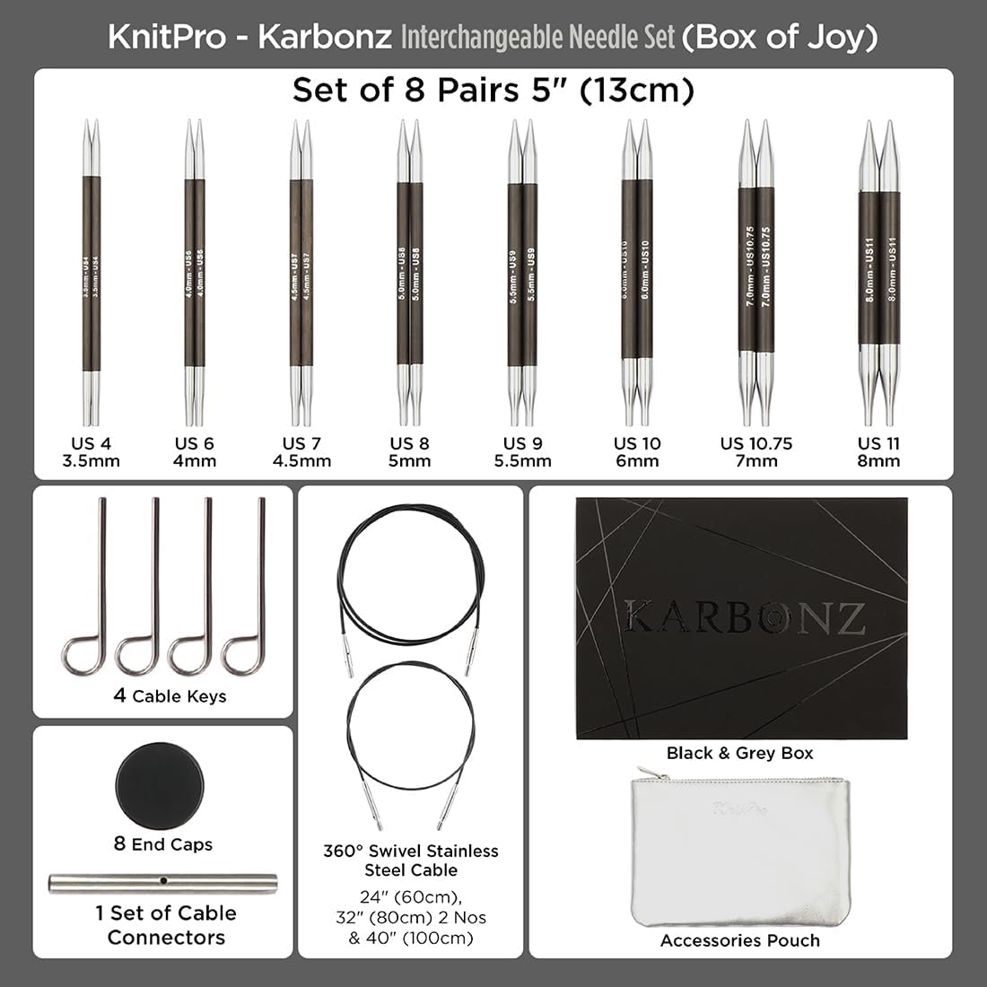 With the KnitPro Karbonz interchangeable needle set deluxe you can get even more flexibility in your knitting project. Screw your needle tips onto the desired cable, tighten them securely with the cable wrench and you're ready to go. The durable needle tips are made from high-quality carbon with electroplated brass points and screw sections. With sharp and gradually tapering tips, these needles are perfect for all knitting projects. Each set contains the following items: 7 x pairs of KnitPro Karbonz interchangeable needle tips in sizes 3.00, 3.50, 4.00, 4.50, 5.00, 5.50 and 6.00mm 4 x cables (1 x 60cm, 2x 80cm, and 1 x 100cm total length including needle tips) 8 x end stoppers 4 x cable wrenches 1 x set of cable connectors Each set comes in a beautiful envelope pouch made of dark grey fabric. The case features a small illustration of two sheep.