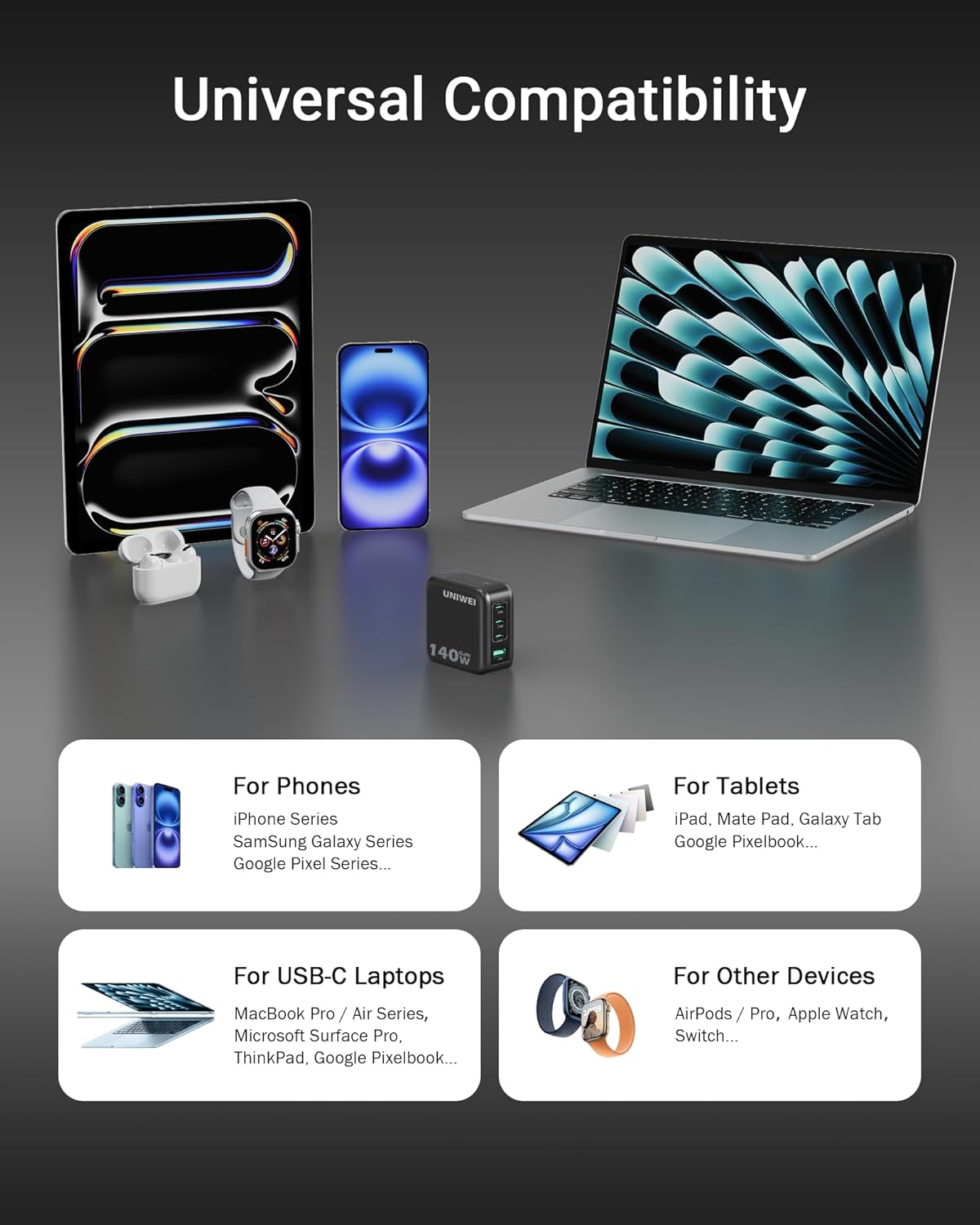 | Compatible Phone Models | iPhone 16 / 15 / 14 / 13 / 12 / SE Series / Samsung S24 / S23 Series / Google Pixel 8 / 7 / HP Chromebook 14 / MacBook Air / Pro Series / Steam Deck DJI Mavic 3/ AirPods And More |