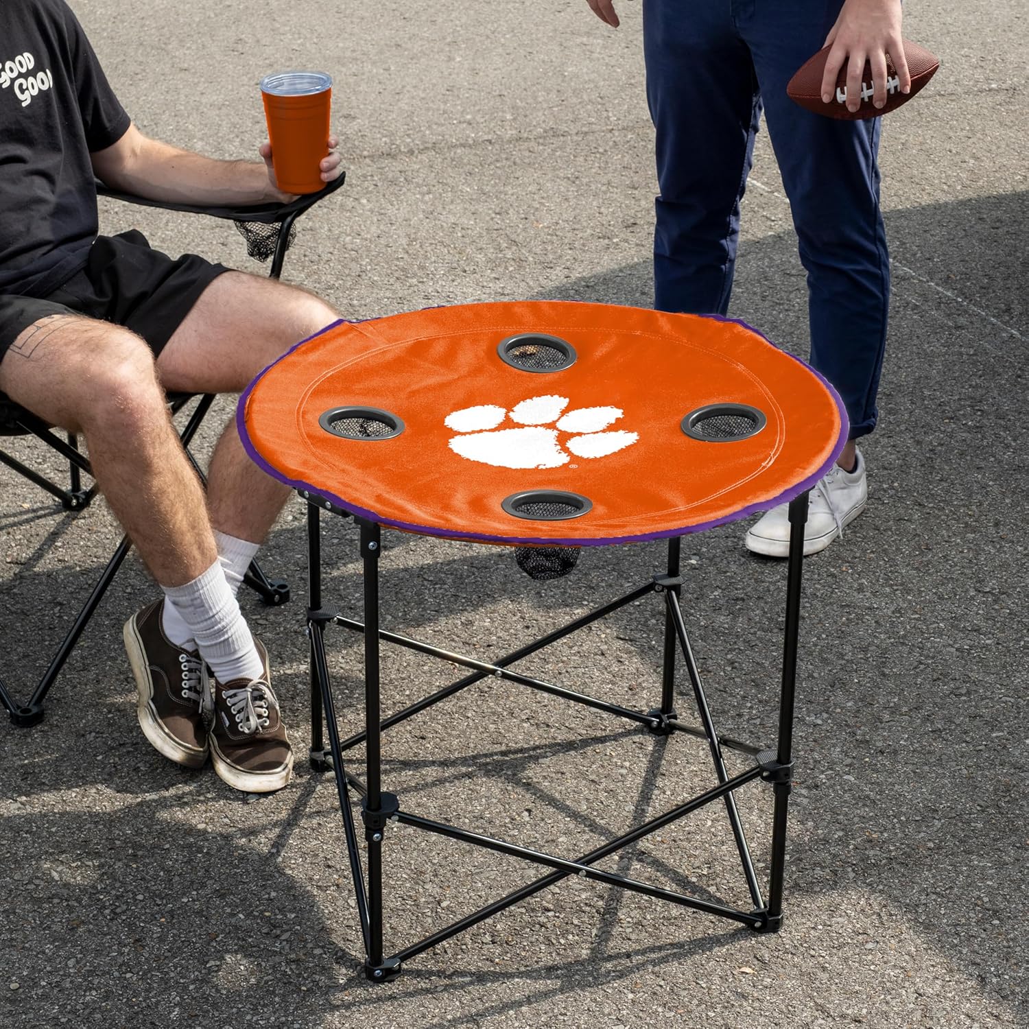 The Round Table is just what the ultimate fan needs for a truly exceptional tailgate party. Made of a powder-coated steel with cross beams, it is sturdy and can hold multiple dishes. Your favorite team's logo is screen printed on the durable polyester 27.6"diameter table surface, which includes four built-in mesh cup holders. This table is portable, folding up easily for storage and transport. It works great for camping, picnics, deck parties and other outdoor activities. The table height matches most Logo Brand chairs. It comes with a convenient matching carrying bag with handles and tear-away label. The table assembles in seconds.