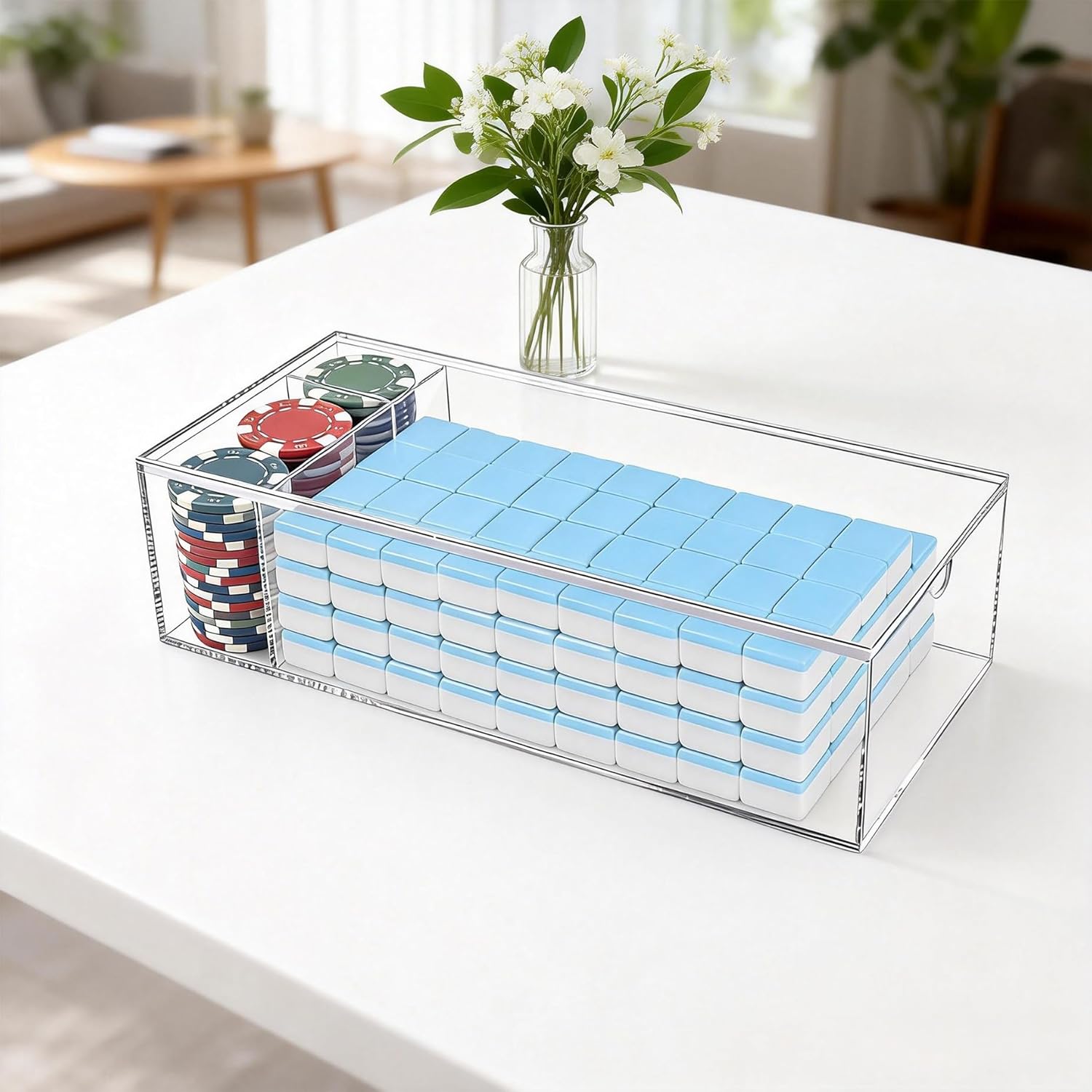 Product Descriptions: Legrape Mahjong Case Fits 1.2x0.9x0.5 Inch American Mahjong Tiles, Acrylic Box for 160 Tiles, Storage Box for Home, Travel (Case Only) Specifications: Material:Acrylic Size: 29.0x8.0x13.0cm/11.4x3.1x5.1inch Color: Clear Package Includes: 1× acrylic mahjong case