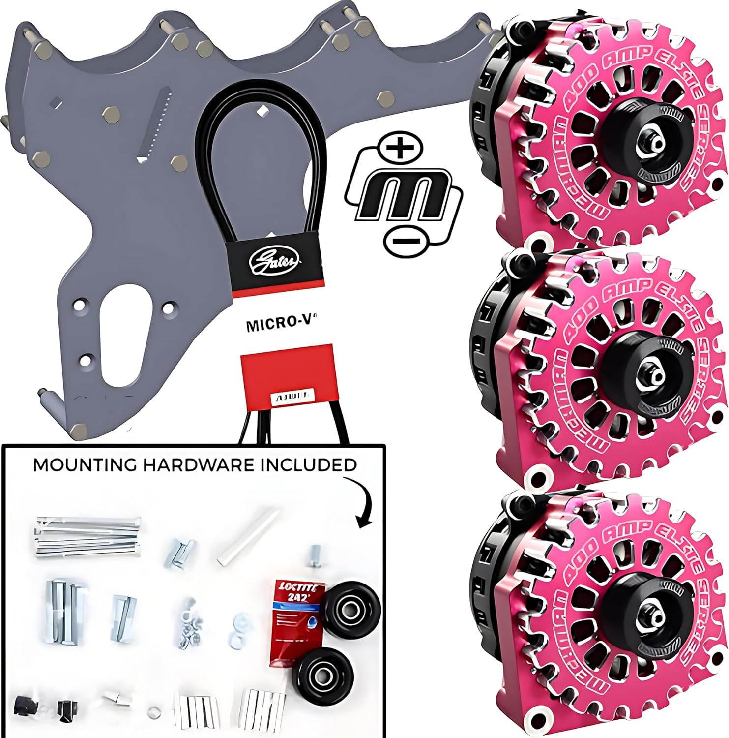 Mechman D305PI Triple Bracket Pink Alternator Kit 05-13 GM Truck/SUV LS-engineThis Listing Includes:(1) Bracket Assembly(3) B8302400PI Alternators(1) Belt(1) Mounting HardwareProduct Description:The Mechman D305PI Triple Bracket Alternator Kit is the ultimate upgrade for 2005-2013 GM Truck/SUV models equipped with LS engines. This high-performance alternator kit is designed to handle the increased electrical demands of modified engines and advanced audio systems, making it an essential component for any performance enthusiast.At the heart of the kit is a high-output alternator engineered for superior power delivery. It provides consistent voltage to your vehicle's electrical system, ensuring optimal performance for your engine and accessories. The triple bracket design adds extra stability, securely mounting the alternator and minimizing vibrations for smoother operation.The Mechman Alternator kit features a striking finish that not only adds a custom, sporty aesthetic to your engine bay but also provides protection against corrosion and wear. This ensures long-lasting durability and maintains the pristine appearance of your engine components.Designed for easy installation, the Mechman Alternator Kit includes all the necessary hardware and components to fit perfectly in your GM Truck/SUV LS-engine models from 2005-2013. Whether you are upgrading for enhanced performance, replacing an old alternator, or customizing your vehicle, this kit offers the reliability and efficiency you need.