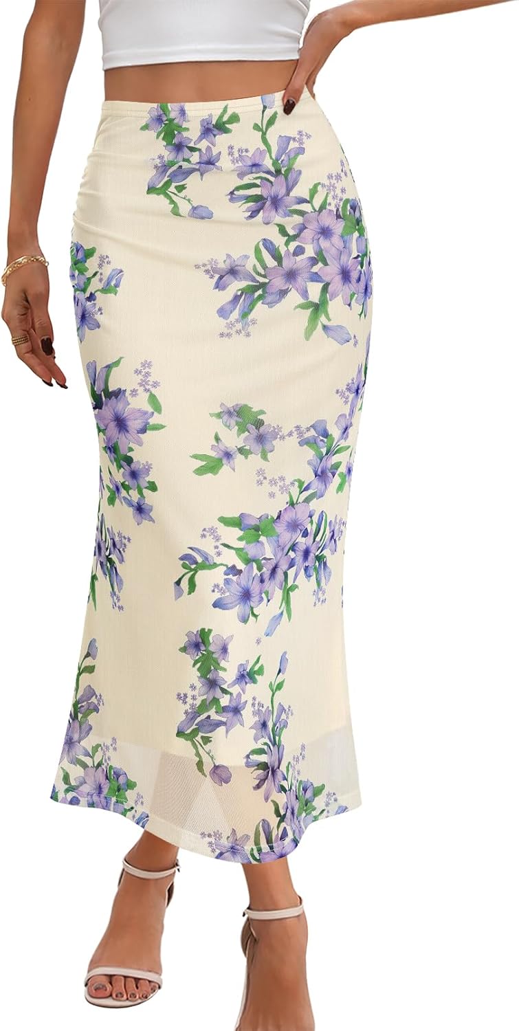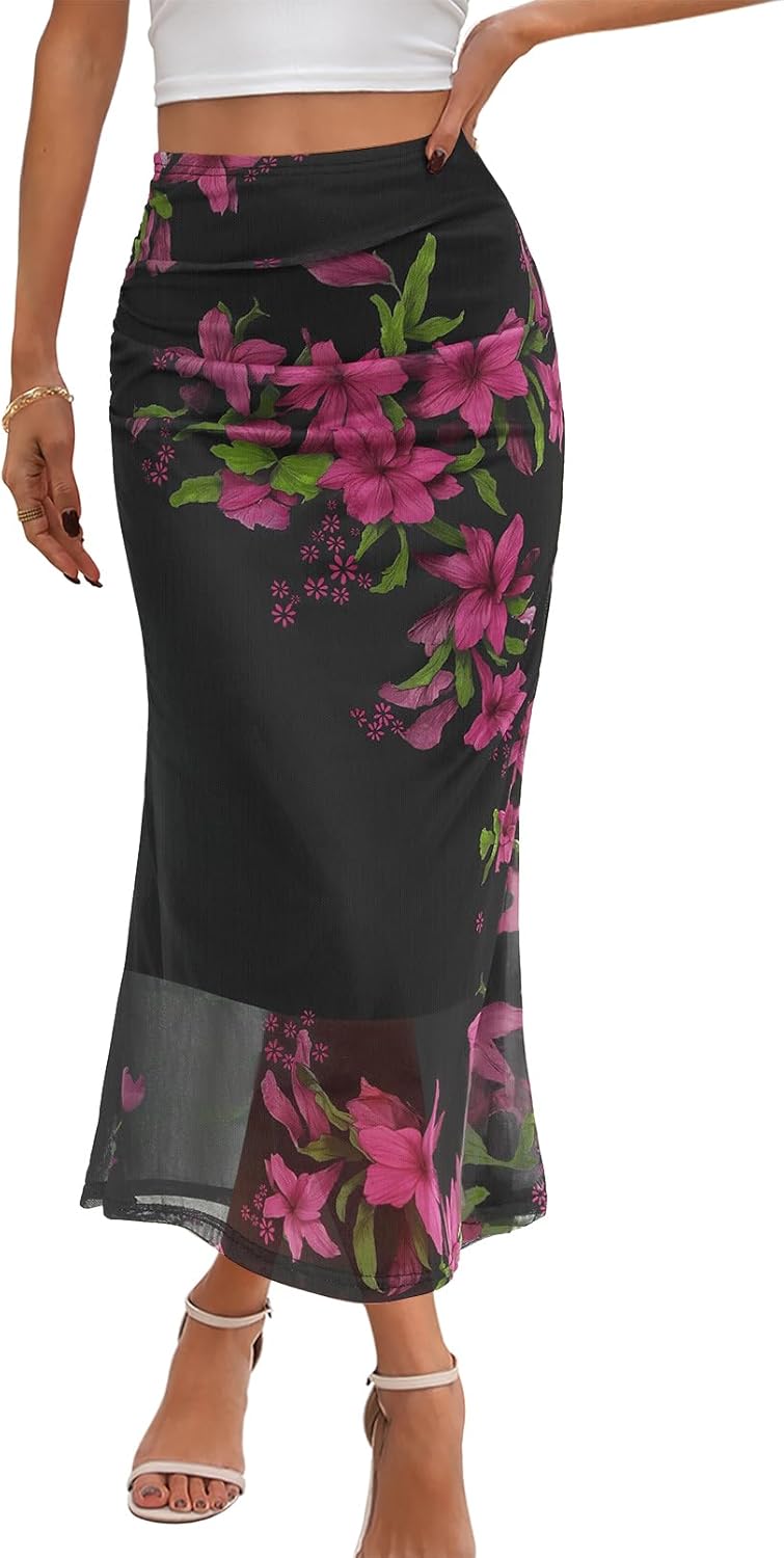 Step into the 2026 spring and summer seasons with the MEROKEETY Women's Floral Mesh Midi Skirt. Adorned with vivid floral prints, it's as if you're carrying a piece of a blossoming garden wherever you go, radiating a natural and fresh allure. The mesh fabric not only gives it an airy quality, keeping you comfortable during warm days but also adds a hint of allure. Designed with a high - waist and elastic waistband, it offers a snug yet comfortable fit. The slim bodycon silhouette hugs your curves gracefully, while the ruched details add a touch of sophistication. With a double-layered and lined construction, it provides both coverage and a luxurious feel. Measuring above the ankle, it strikes the perfect balance between elegance and practicality for the warm seasons. This high-waist skirt is a chameleon in your wardrobe, fitting seamlessly into various scenarios. Planning a fun-filled party? Its trendy design will make you stand out on the dance floor. Going on a romantic date? The feminine fishtail shape at the bottom adds an extra dose of charm. Heading to the clubs, and beaches, or enjoying a night out during the holidays? It's an excellent choice. Whether it's a casual cocktail gathering or an evening stroll on the street, this skirt complements your style, allowing you to move from daytime casual to evening glamour effortlessly. The styling possibilities with this skirt are vast. For a trendy and youthful ensemble, pair it with a crop top. It creates a look that's suitable for a day out with friends or a music festival. If you're aiming for a laid-back vibe, a simple T-shirt will do the trick. For more formal or sophisticated occasions, match it with blouses, vests, or blazers. Layer it with jackets or coats when the temperature drops. When it comes to footwear, high heels can elevate the look for a night event, while sandals are a great option for a beach outing or a casual summer day, making it easy to express your personal style.