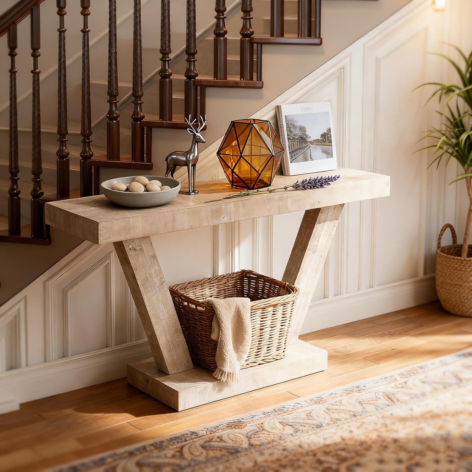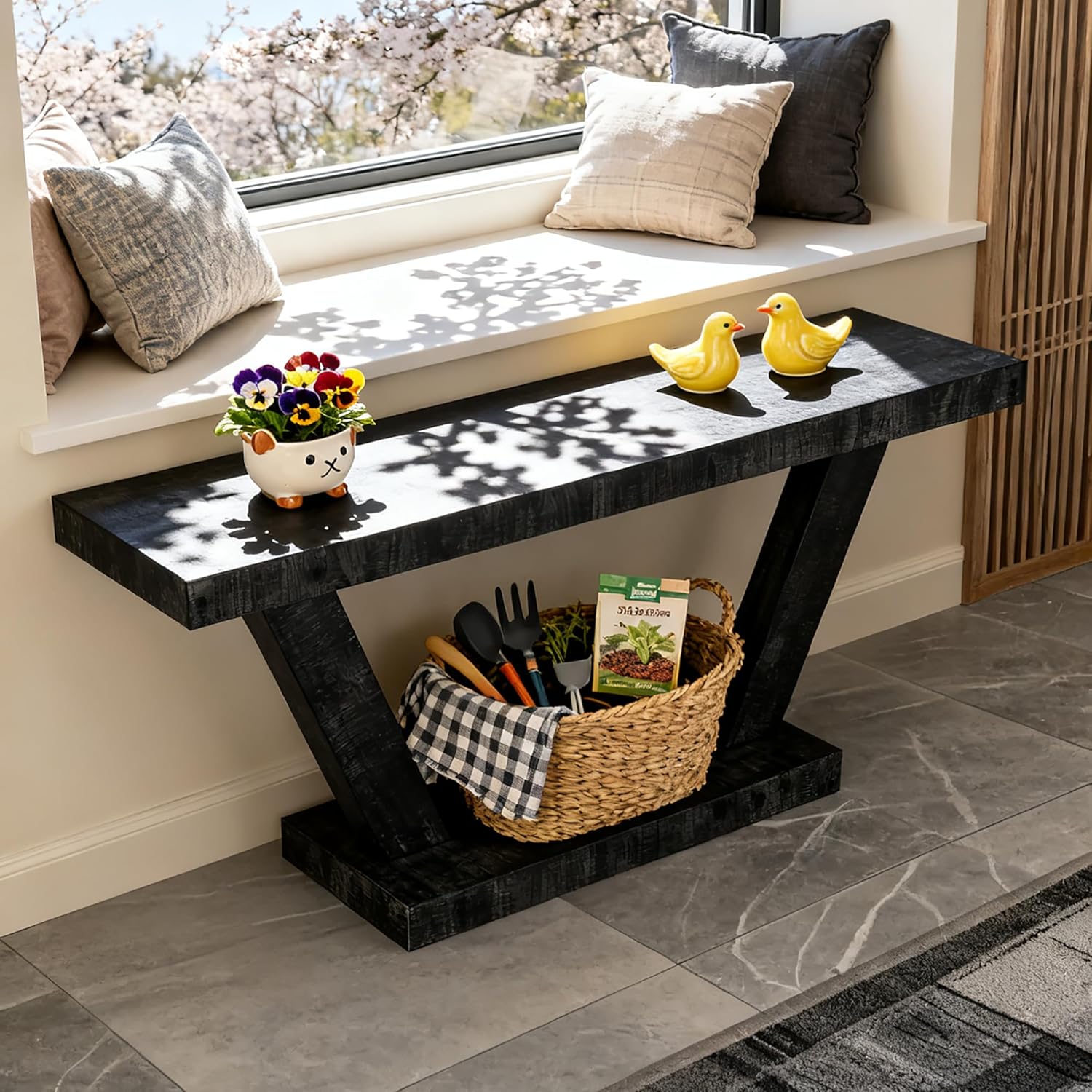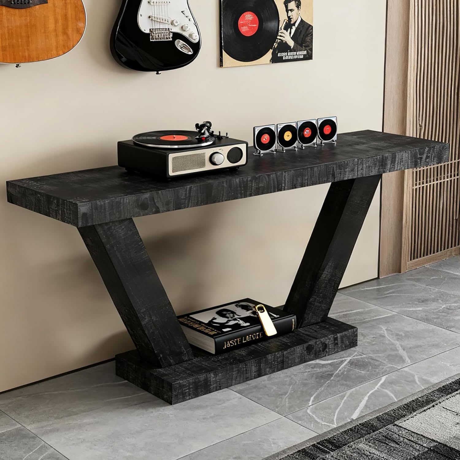 Imagine stepping into a home that feels both warmly inviting and impeccably styled. Our 60-inch Vintage Distressed Wood Entryway Bench is the centerpiece that makes this vision a reality. More than just a console table, it's a statement of rustic elegance and practical storage, designed to transform your hallway, living room, or sofa-back area into a organized and stylish haven.Product SpecificationsColor:Antique BlackMaterial: MDFFilling: Solid Wood + MDFStyle: AntiqueSuitable for: Primary Living SpaceTable Shape: RectangularStorage Type: Open StorageMounting Type: Floor MountTable Shape: RectangularSurface Finish: LacqueredUsage: Console TablesProduct Dimensions: Assembled Length (inches): 60.00; Assembled Width (inches): 15.60; Assembled Height (inches): 31.50; Product Weight (lbs): 47.30Packaging Dimensions:Length (inches): 65.35; Width (inches): 18.50; Height (inches): 9.84; Weight (lbs): 57.40