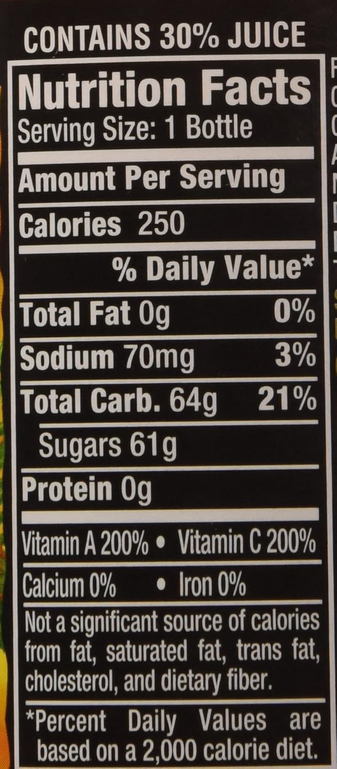 Juice blend drink from concentrate. Flavored with other natural flavors. 220 calories per bottle. Gluten free. Excellent source of Vitamin C. 25% juice from a blend of orange, pear and carrot juice. dpsg.com. Please recycle. Produced under the authority of Mott's LLP, 5301 Legacy Drive, Plano TX 75024.