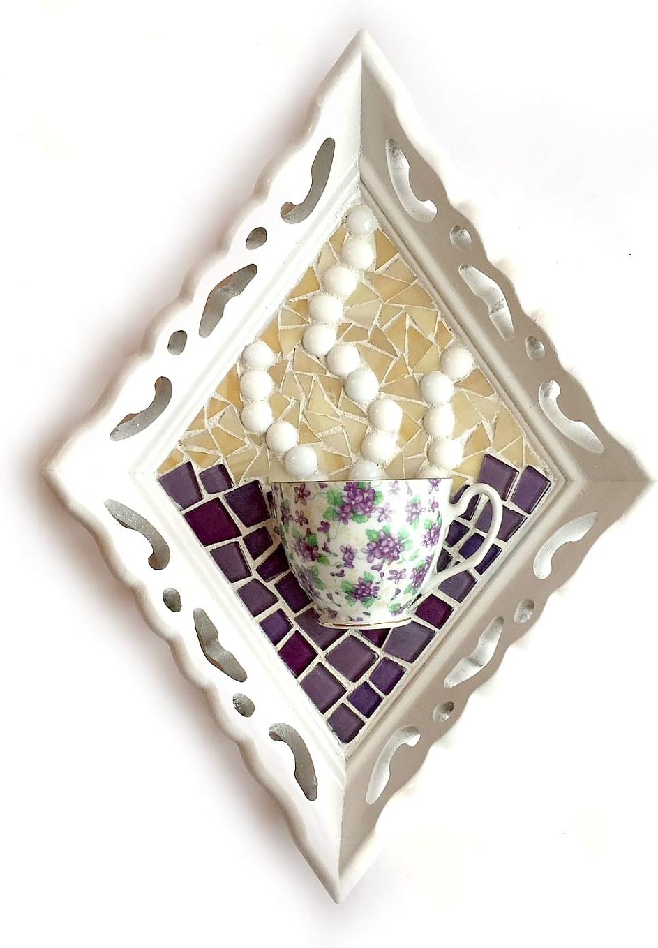 This mixed media mosaic piece features a purple violet floral teacup. It's surrounded by various shades of purple mosaic glass tiles, hand cut cream colored glass and white glass round gems to mimic "steam". This piece is framed a vintage wooden frame with pretty scallops and cutouts. I painted it a nice glossy white to match the white background of the cup and the white grout that holds it all together. Overall, this piece measures 10 inches wide x 14 inches long x 1.75 inches deep. It's comes ready to hang. What a great gift!