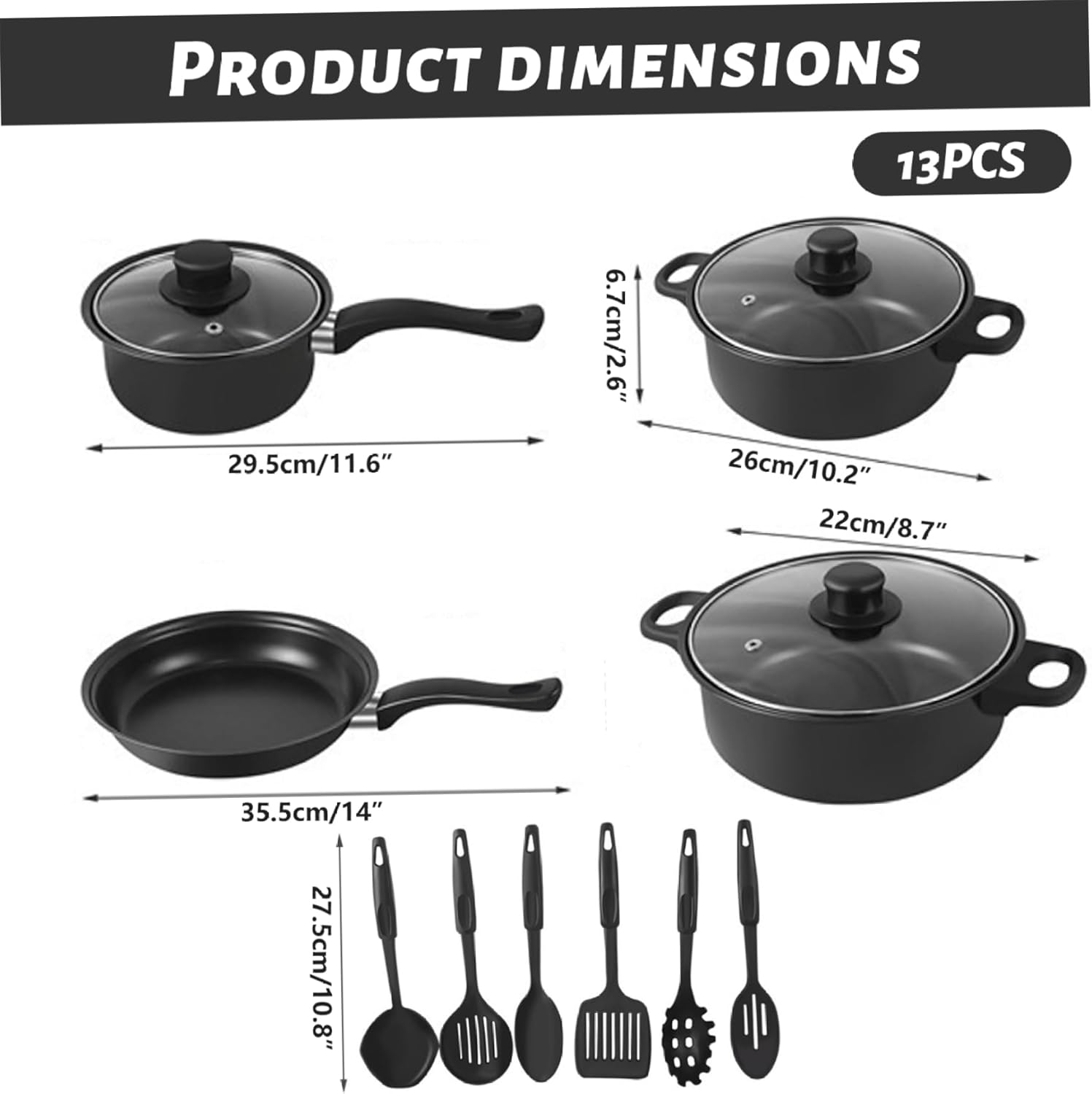Description: This 13-piece non stick pots and pans set makes a comprehensive cookware solution for both beginner and experienced home cooks, featuring frying pans, saucepans, lids, a spoon, spatula, and additional essential tools. Each piece is engineered with a high-quality non-stick coating that prevents food from sticking and facilitates easy cleanup, promoting healthier cooking with minimal oil usage. The set's construction ensures even heat distribution, eliminating hot spots to cook meals uniformly, enhancing flavor and texture. Ergonomically designed handles provide heat resistance and a secure grip, ensuring safe handling and comfortable use during cooking. The versatile assortment meets all your daily cooking needs, from sautéing and frying to simmering and boiling. Its smart nesting design saves kitchen space by allowing pots and pans to be stacked securely with lids, aiding in neat and efficient storage. This cookware set balances durability, usability, and style, transforming everyday cooking into a pleasurable experience while increasing kitchen efficiency. With optimized non stick pots and pans that cater to various cooking styles, this set is a practical and valuable addition to any kitchen. Features:. -Color: Black. -Material: Cast iron. -Size:. Frying pan: 35.5*22*4.5 cm. Soup pot: 30*22*7.5 cm. Soup pot: 26*18*6.7 cm. Milk pot: 29.5*16*7 cm. Note:Manual measurement, please allow slight errors on size.The colors may exist slight difference due to different screens. Package Including 1 * Non Stick Pots and Pans Set