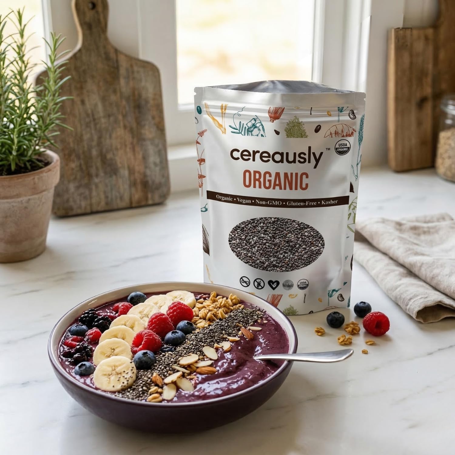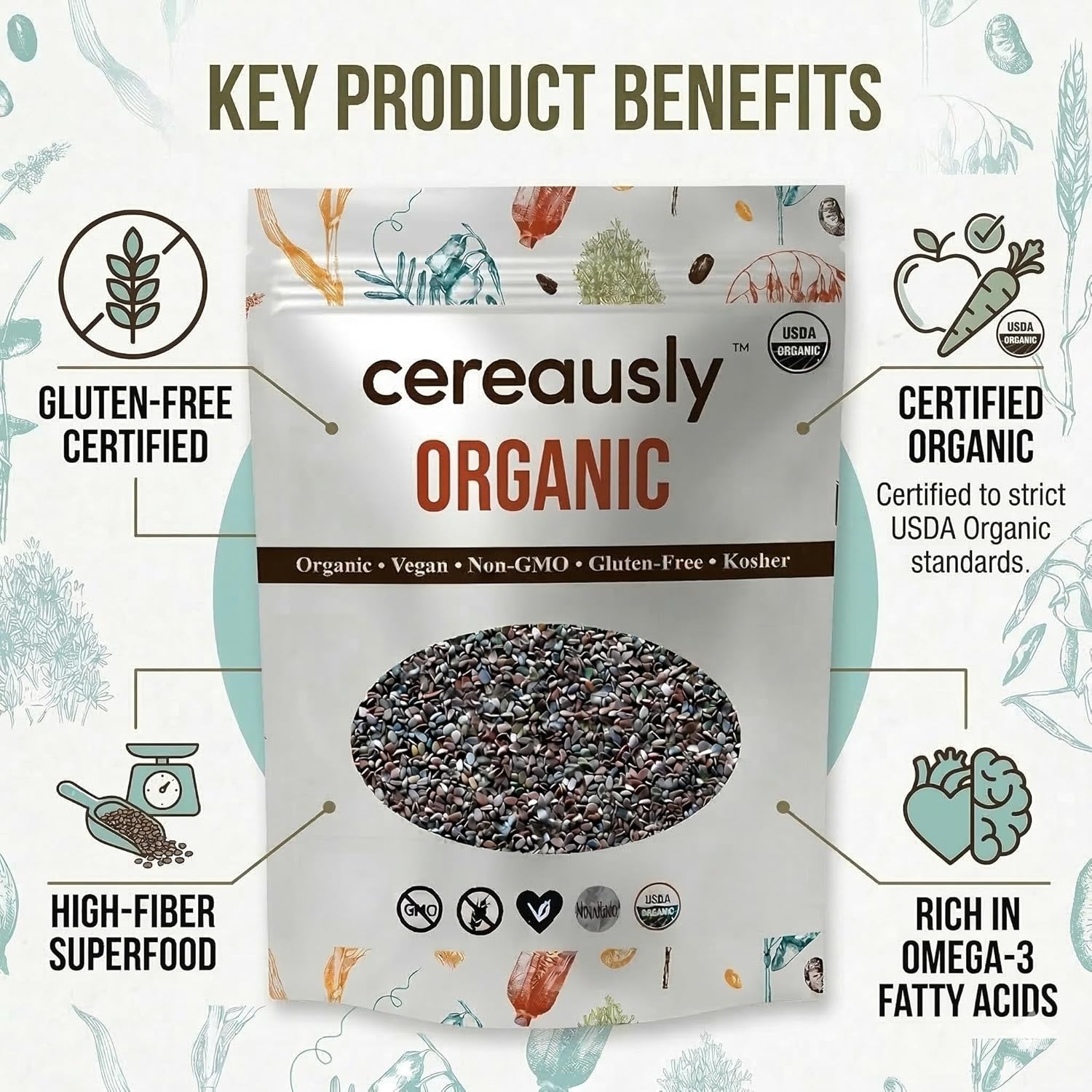 Cereausly Organic Black Chia Seeds are nutrient-dense superfood seeds packed with fiber, omega-3 fatty acids, plant-based protein, and antioxidants. These USDA Certified Organic whole chia seeds are naturally gluten-free, vegan, non-GMO, and kosher. With their mild flavor and versatile texture, chia seeds are easy to incorporate into everyday meals. Add them to smoothies, yogurt, overnight oats, chia pudding, oatmeal, baked goods, salads, or healthy snacks. This 25 lb bulk bag is ideal for restaurants, bakeries, smoothie shops, meal prep kitchens, and heavy home users who want a reliable supply of premium organic chia seeds. Cereausly chia seeds are carefully sourced and packed to deliver consistent quality, making them a great ingredient for both professional kitchens and everyday healthy cooking.