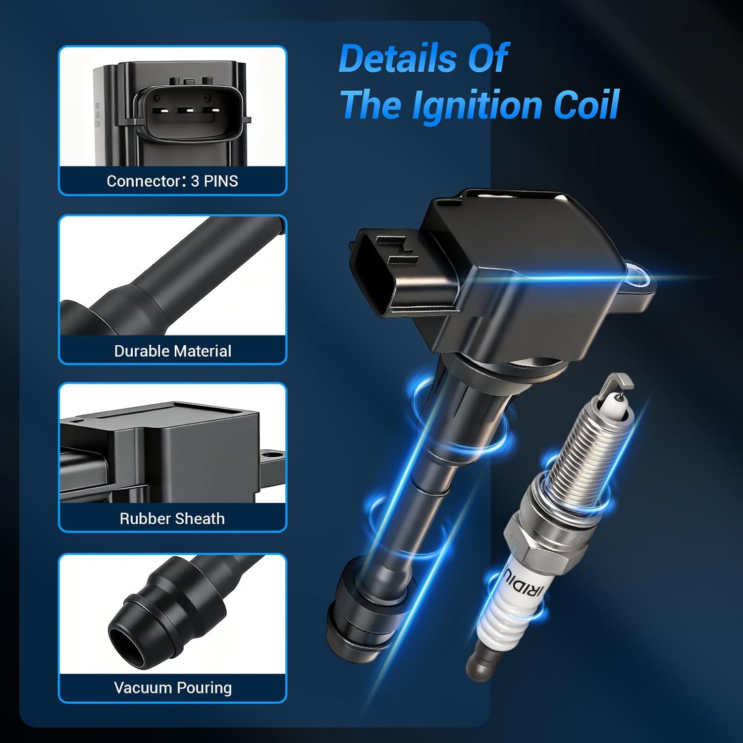 • Premium Performance:Spark Plugs And Coil Packs Kit need to respond quickly to ECU instructions.Advanced thermoplastic ignition coils connector ensures proper connection and resists fractures caused by heat and thermai cycling, to better transfer the high voltage created by the engine's spark plug.The spark plug is double iridium spark plug,have a much longer working life, can work 100000 kilometers, consistent and stable spark.Highly conductive copper wire and high dielectric performance epoxy ensure excellent connectivity and long service life.
