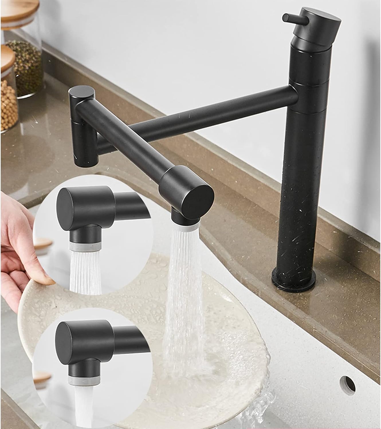 FaucetsName: Pot Filler FaucetFaucet Type: Kitchen FaucetStyle: Contemporary Feature: 360 Rotating Faucet Main Body Material: Brass Finish: Black, ChromeValve: Ceramic Valve Cartridge Life Time: 500,000 cycles Water Feature: Mix Hot and Cold Water Water Outlet Modes: Stream / Spray Installation Holes: One Hole Number of Handles: Single Handle Diameter of Installation Hole: 31-40mm Installation Type: Deck-Mounted Package Contents : 1 x Kitchen Sink Taps2 x Mixer HosesInstallation Accessories Warm Reminder:1. Check that all accessories are complete before installation.2. Manual measurement of various sizes has a certain error. Please refer to the actual product!3. The project may be slightly different from the picture due to the display of lights and displays.