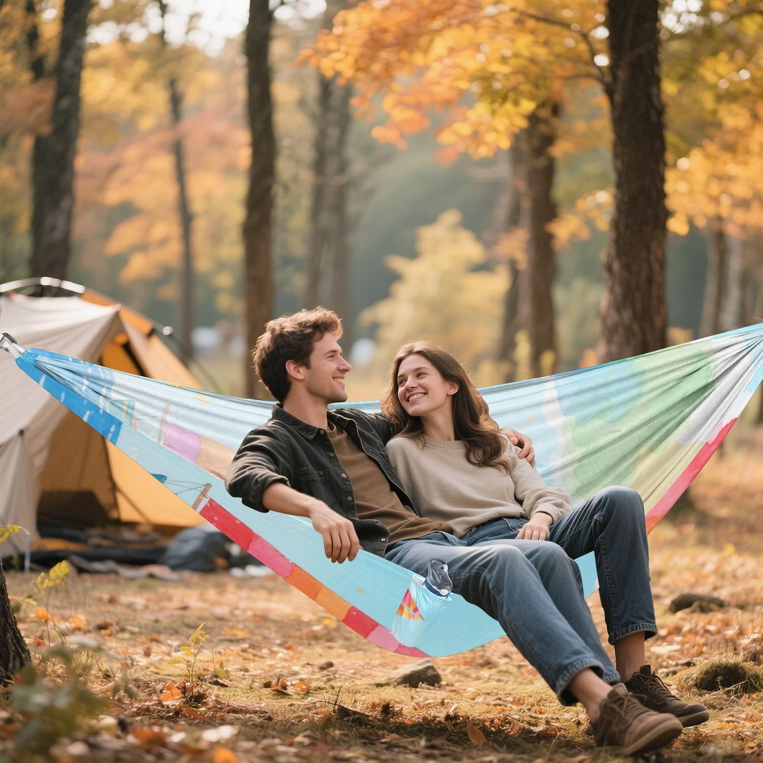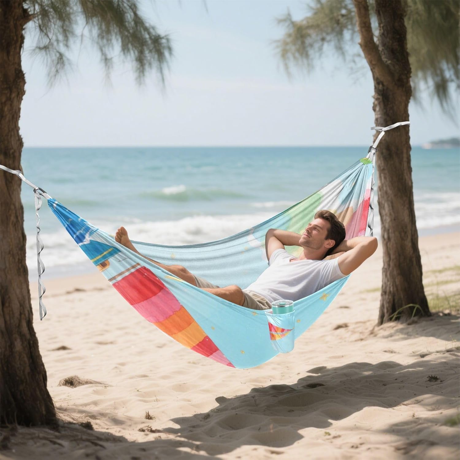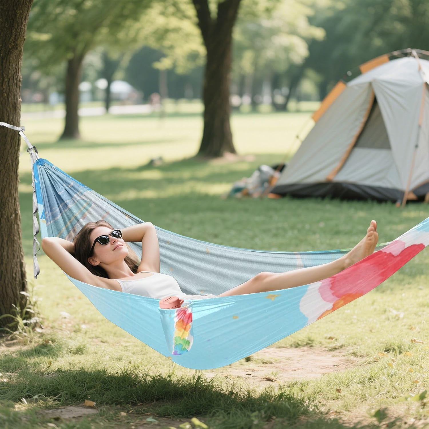 Size: 114 x 54.33 inches /290cm ×138 cm. This single Rope Hammock is spacious enough to accommodate 1 adult and 1 child, allowing you to enjoy quality time with your kids. It can bear a load of 330LB/150KG.Material Description: Polyester. Portable Hammock fabric is made of high-strength and breathable 210T polyester taffeta, which has excellent wear resistance, tear resistance and breathability, ensuring comfort and safety. The climbing buckle is made of aluminum alloy, and the tree belt is made of high-density 600D imitation nylon webbing, which is sturdy with strong load-bearing capacity.Design: This edge of Swing Hammock is equipped with hanging pockets, which can be used to store personal items. Hammock is relatively light in overall weight. A single hammock usually weighs 490g and can be folded for storage. When folded, it is compact in size and easy to carry.Lightweight and Multi-purpose Hammock: Whether you are going camping, hiking or relaxing in the garden, this Backyard Hammock can meet your needs. Moreover, this is a necessity for going camping and having fun.Warm Reminder: When cleaning this Hanging Hammock, remember to remove the climbing at both ends. If you have any questions, please contact our customer service by email and we will answer your doubts in a timely manner.