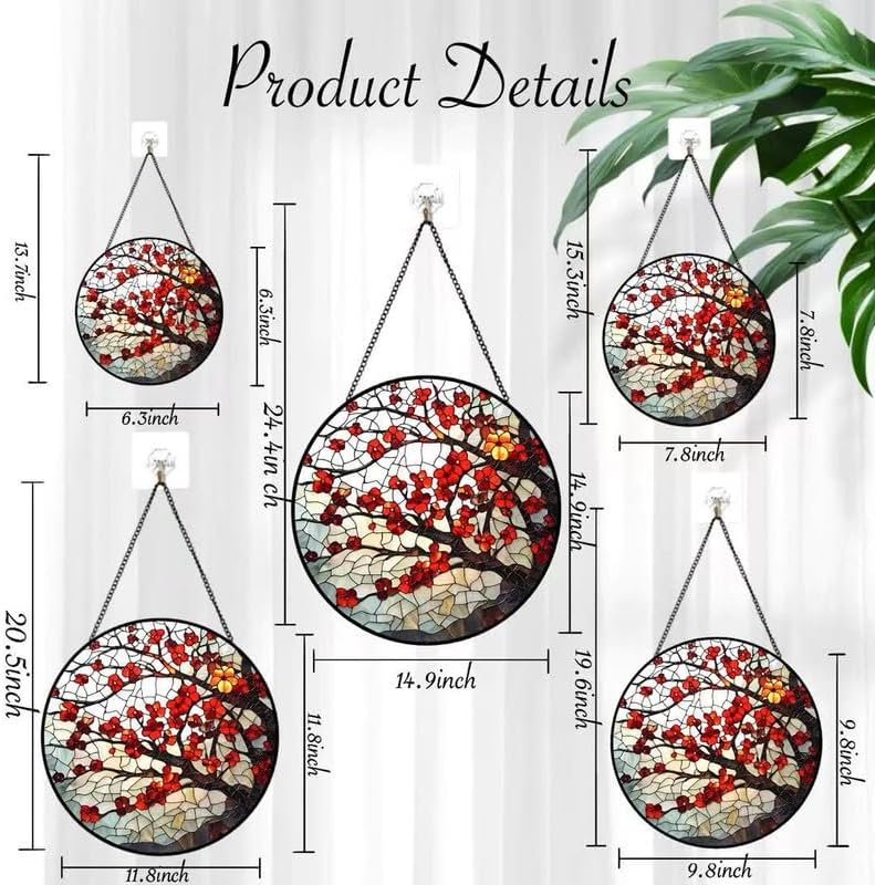 Bring natural elegance and artistic charm into your home with this Red Blossom Stained Glass Suncatcher. Inspired by blooming cherry and plum blossoms, this round glass panel showcases a tree full of vibrant red flowers with a delicate handcrafted stained glass appearance. As sunlight shines through the glass, the blossoms illuminate with warm tones that add depth and brilliance to any window space. The combination of red florals, flowing tree branches, and soft background tones creates a timeless and calming decorative piece. Made with high-quality stained glass and a reinforced metal frame, this floral suncatcher is durable, easy to hang, and suitable for any room. Whether used as everyday décor or given as a meaningful gift, it adds beauty, light, and nature-inspired artistry to your home.