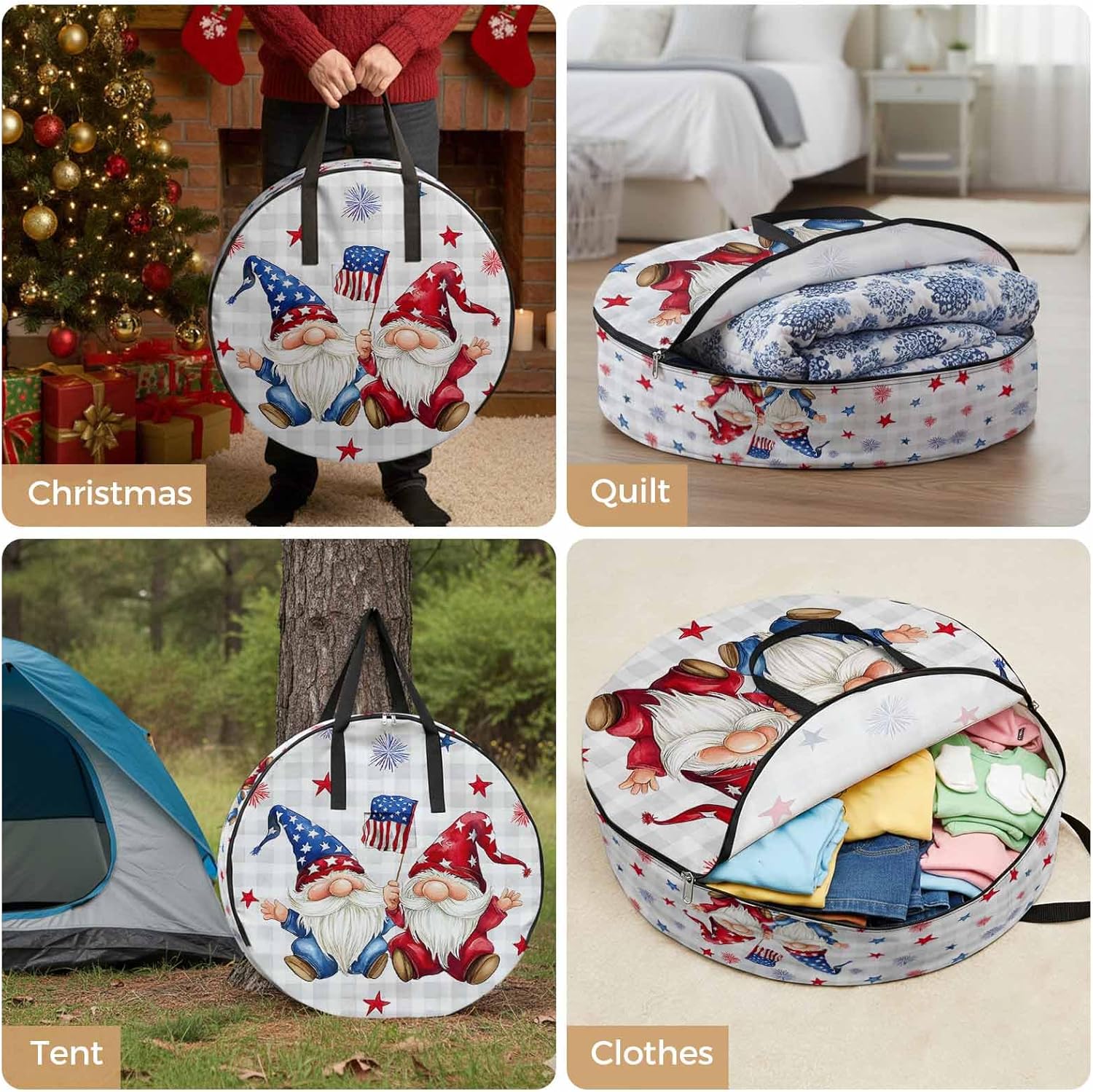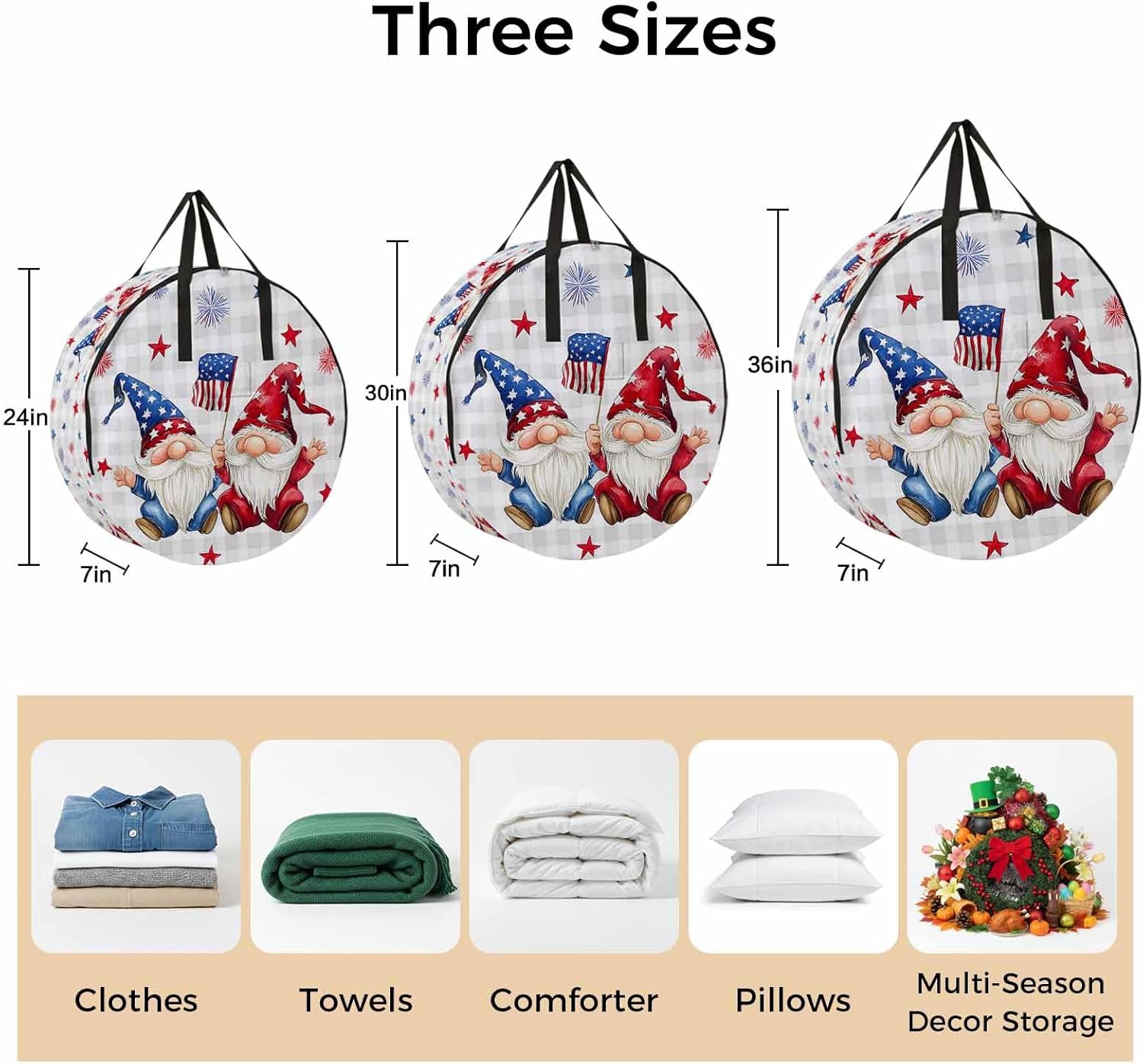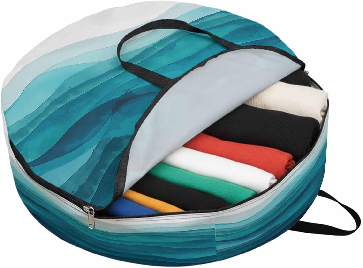 Reclaim Your Closet Space with the Round Storage Solution! Material: polyester Diameters: 24 inch, 30 inch, 36 inch Depth: 7 inches Package Includes: Round Storage Bag One Bag, Endless Possibilities: Whether you are swapping out your summer wardrobe, moving into a new dorm, or packing away holiday decorations, this bag has you covered. The circular design is uniquely suited for: Bedding: Comforters, quilts, sheet sets, and oversized pillows. Clothing: Winter coats, sweaters, and bulky ski gear. Home Decor: Holiday wreaths, garlands, and floral arrangements. Outdoor Gear: Camping blankets, sleeping bags, and beach towels. Dual Zippers: The high quality double zipper design allows the closet organizer to open wide from both sides, making it effortless to load and unload even the bulkiest comforters or wreaths. Reinforced Handles: Sturdy, reinforced handles are securely stitched to provide extra strength and a comfortable grip when carrying heavy loads or pulling the bag from under a bed. Clear Label Pocket: A transparent built-in label holder allows you to quickly identify the contents of each bag without ever having to unzip it, keeping your storage perfectly organized.