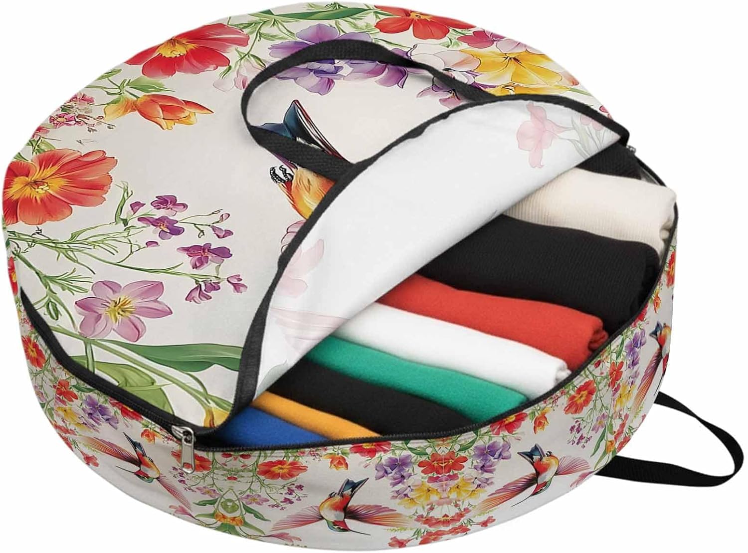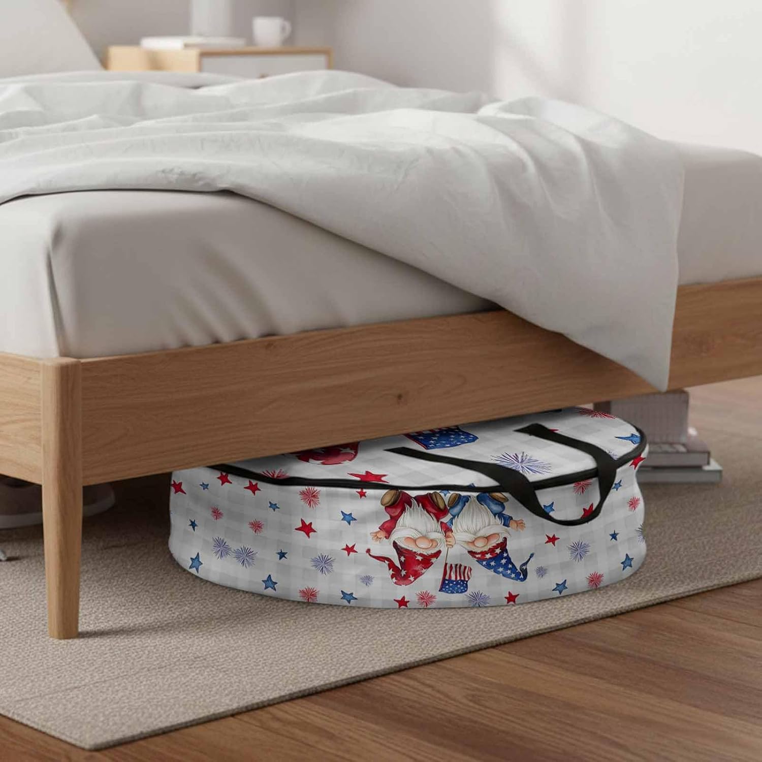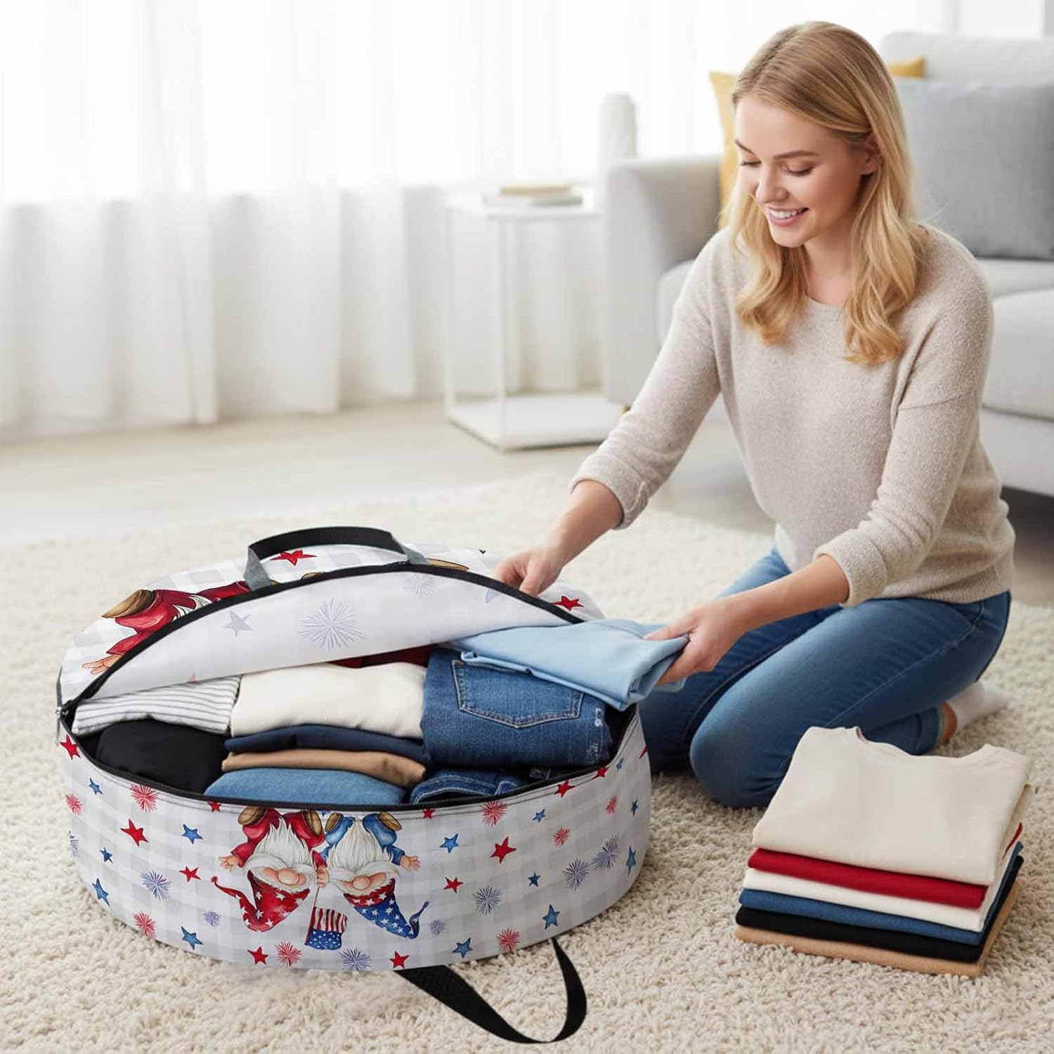 Reclaim Your Closet Space with the Round Storage Solution! Material: polyester Diameters: 24 inch, 30 inch, 36 inch Depth: 7 inches Package Includes: Round Storage Bag One Bag, Endless Possibilities: Whether you are swapping out your summer wardrobe, moving into a new dorm, or packing away holiday decorations, this bag has you covered. The circular design is uniquely suited for: Bedding: Comforters, quilts, sheet sets, and oversized pillows. Clothing: Winter coats, sweaters, and bulky ski gear. Home Decor: Holiday wreaths, garlands, and floral arrangements. Outdoor Gear: Camping blankets, sleeping bags, and beach towels. Dual Zippers: The high quality double zipper design allows the closet organizer to open wide from both sides, making it effortless to load and unload even the bulkiest comforters or wreaths. Reinforced Handles: Sturdy, reinforced handles are securely stitched to provide extra strength and a comfortable grip when carrying heavy loads or pulling the bag from under a bed. Clear Label Pocket: A transparent built-in label holder allows you to quickly identify the contents of each bag without ever having to unzip it, keeping your storage perfectly organized.