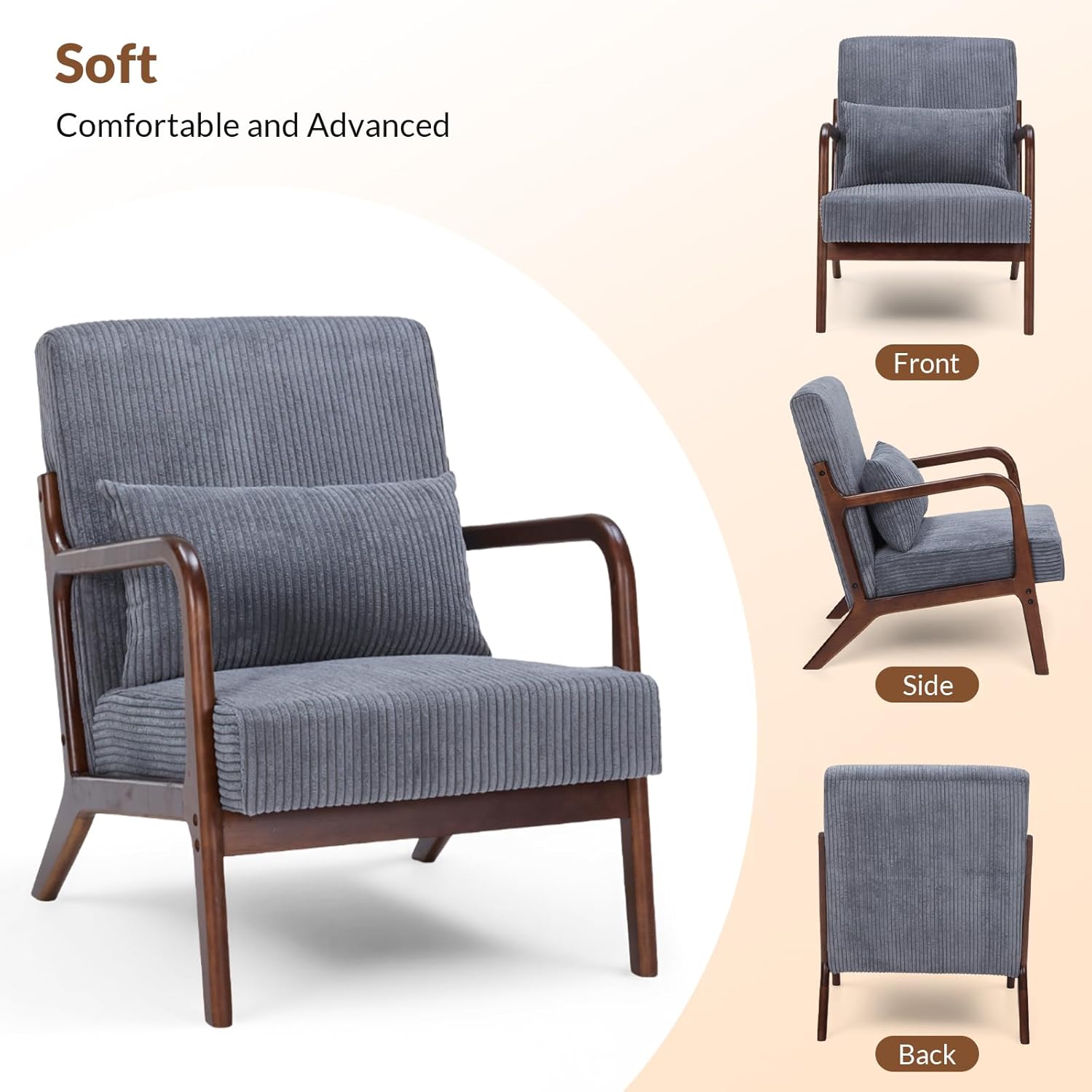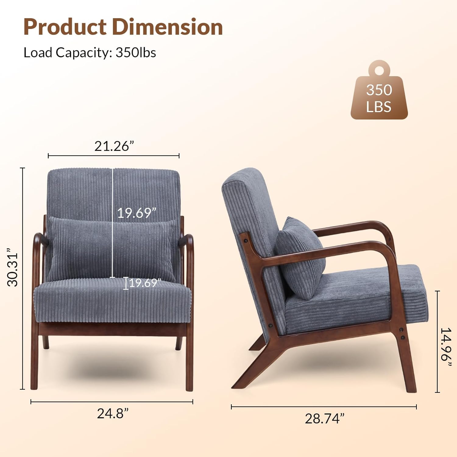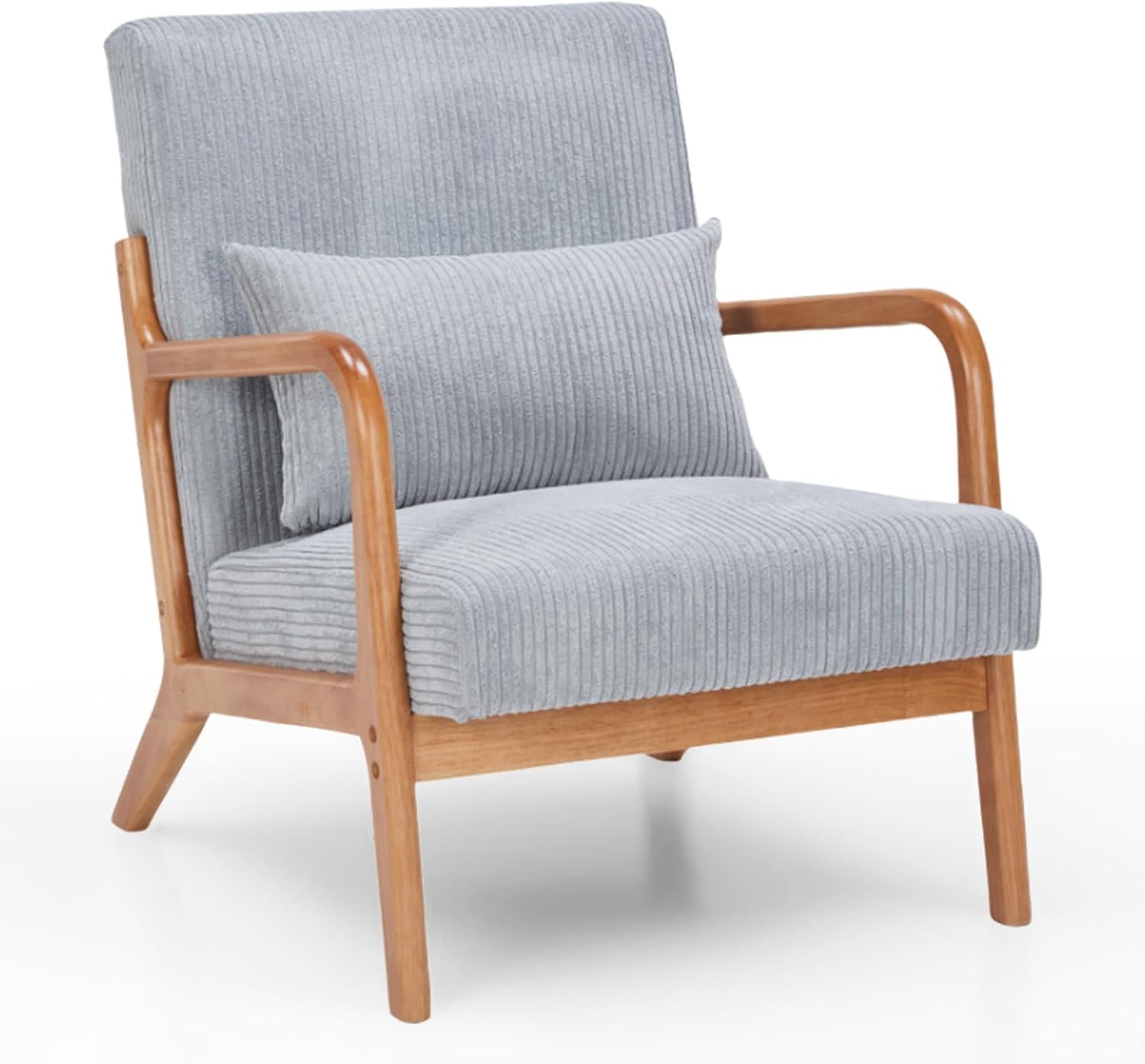 Transform your space with this mid-century modern fabric accent chair.The elegant low-profile seat, striped upholstery, and rubber wood legs bring a classic charm to any room. The curved backrest and minimalist design make it an eye-catching piece in your living room, bedroom, or office.Built with a sturdy rubber wood frame, this chair supports up to 350lbs, ensuring durability and long-lasting stability.The high-density foam seat and backrest (12cm/4.7in thick), combined with resilient sinuous springs, offer exceptional comfort, making it ideal for lounging or reading for hours.Assembly is quick and simple with the included instructions—no extra tools required. Style, comfort, and reliability all in one perfect chair.