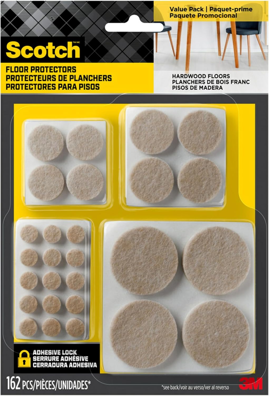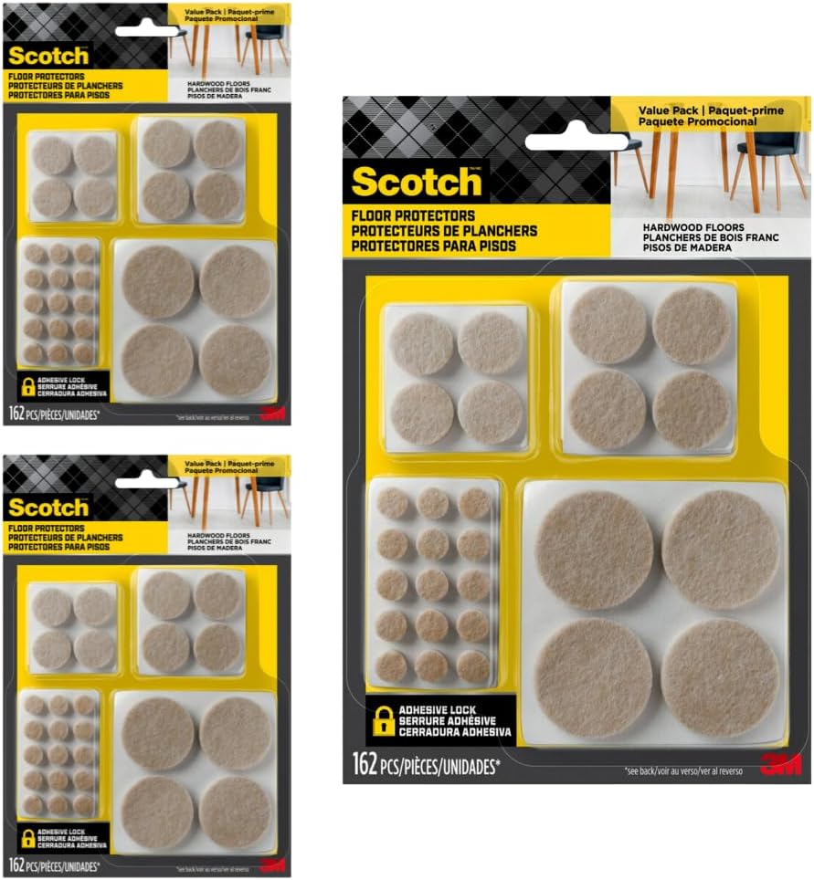 Protect your home with felt chair pads for wood, tile, laminate, and vinyl floors. Scotch Felt Pad Floor Protectors for Chairs are not only great for similar furniture like tables, stools, couches, and nightstands, but these adhesive felt feet are perfect for lamps, plants, trash cans, or anything on a finished surface. To make these floor protector pads easy as possible to work with, they have their own built-in adhesive to make installation just a quick peel and stick.