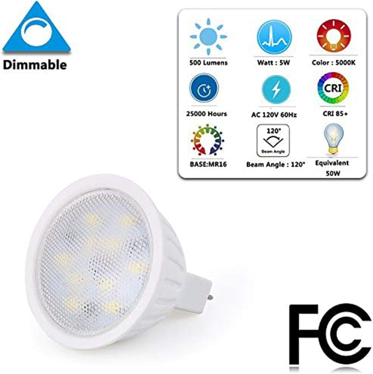Please note 1.The basic voltage in the USA is usually 12 voltage for mr16 bulb. If you find that our MR16 120V bulbs cnanot working on your mr16 fixtures, please check whether the voltage matches the MR16 120V bulbs. 2.Please make sure the gu5.3 two pins are suitable for your socket3.If you need to return the product because of the voltage mismatch, please choose the I accidentally ordered the wrong item as the reason for the return Thank you very much for your kind helpProduct Type: 120 Volt 5 Watt 5000K Daylight White Dimmable LED MR16 Bulb Specifications: Base: standard MR16 Base Luminous:500 lmInput Voltage: 120V BeamAngle: 120 degree Lifespan: 25,000 hours Luminous Flux: 500 Lumens CRI: 85+ Features: 1. Easy to install, can be easily fitted MR16 socket. 2. Energy saving, save dramatically on energy costs compared to incandescent lamps. 3. Instant-on to full brightness, no flicker. 4. No more maintenance, long lifespan. Applications: Standard seramic MR16 Base, the MR16 LED light bulb can be easily screwed in the existing fixtures without replacing the whole fixture. Outstanding heat dissipation light bulbs are ideal for general indoor lighting in living room, bedroom, kitchen, hallway and much more applications, such as accent lights, track lighting, outdoor fixtures, landscape lighting etc. Package included: 6 X MR16 LED light bulbs Note: 1,As the road is far away, if there is any damage, please contact us in time, thank you for your understanding. 2. Please note that the working voltage of the item was 120V,ONLY work safely at AC110-130V, Please do not use it on the low voltage of 12V. 3. No matter working indoor or outdoor landscape light fixtures, please make sure to protect this bulb from water and don’t use it in totally enclosed luminaires