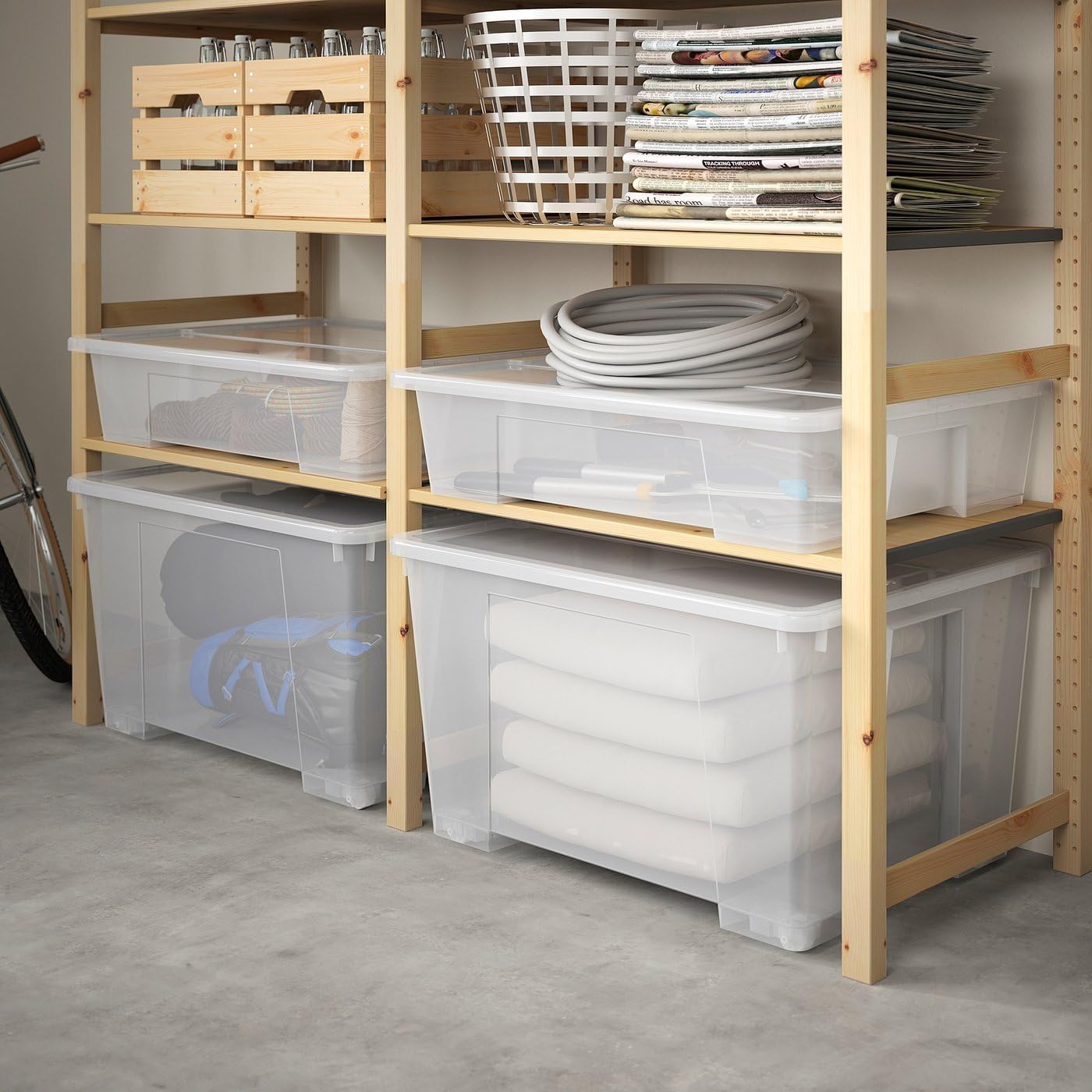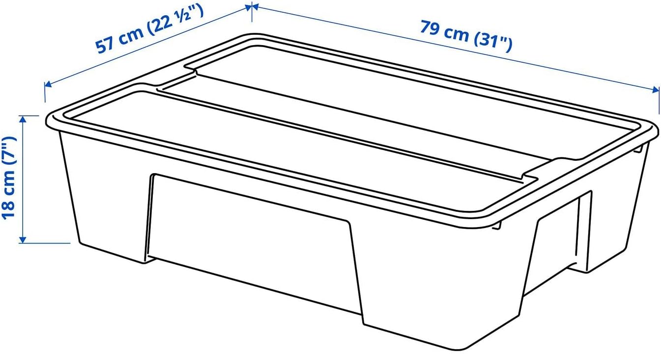 This mid-size box is shallow and perfect for storing shoes or fragile items that you don’t want to stack. The clear plastic reveals the contents inside so you can easily find what you’re looking for.✔ Product Details✔ Put an end to searching for things you stored away. The transparent plastic reveals the contents inside so you can easily find what you are looking for.✔ The built-in click lock function keeps the lid in place which protects your things from dirt and dust.✔ Suitable for storing seasonal items, sports equipment, gardening tools or washing and cleaning equipment.✔ Can also be used as a storage box underneath the bed.✔ Good to Know✔ Recommended for indoor use only.✔ Product is possible to recycle or use for energy recovery, if available in your community.✔ Not approved for food contact.Material✔ PolypropyleneCareBox/lid for box, 15&34 gallon✔ Wipe clean with a soft cloth dampened with water and a mild dish detergent or soap, if necessary.✔ Safety and Compliance✔ WARNING! When the lid is on, the box is airtight. Therefore, do not let young children play with the box.✔ Tested and approved for bathroom use.