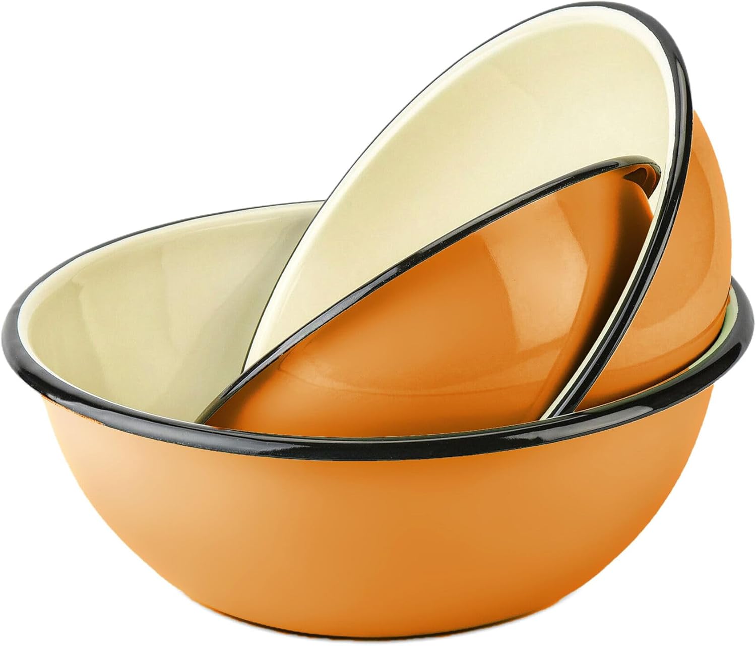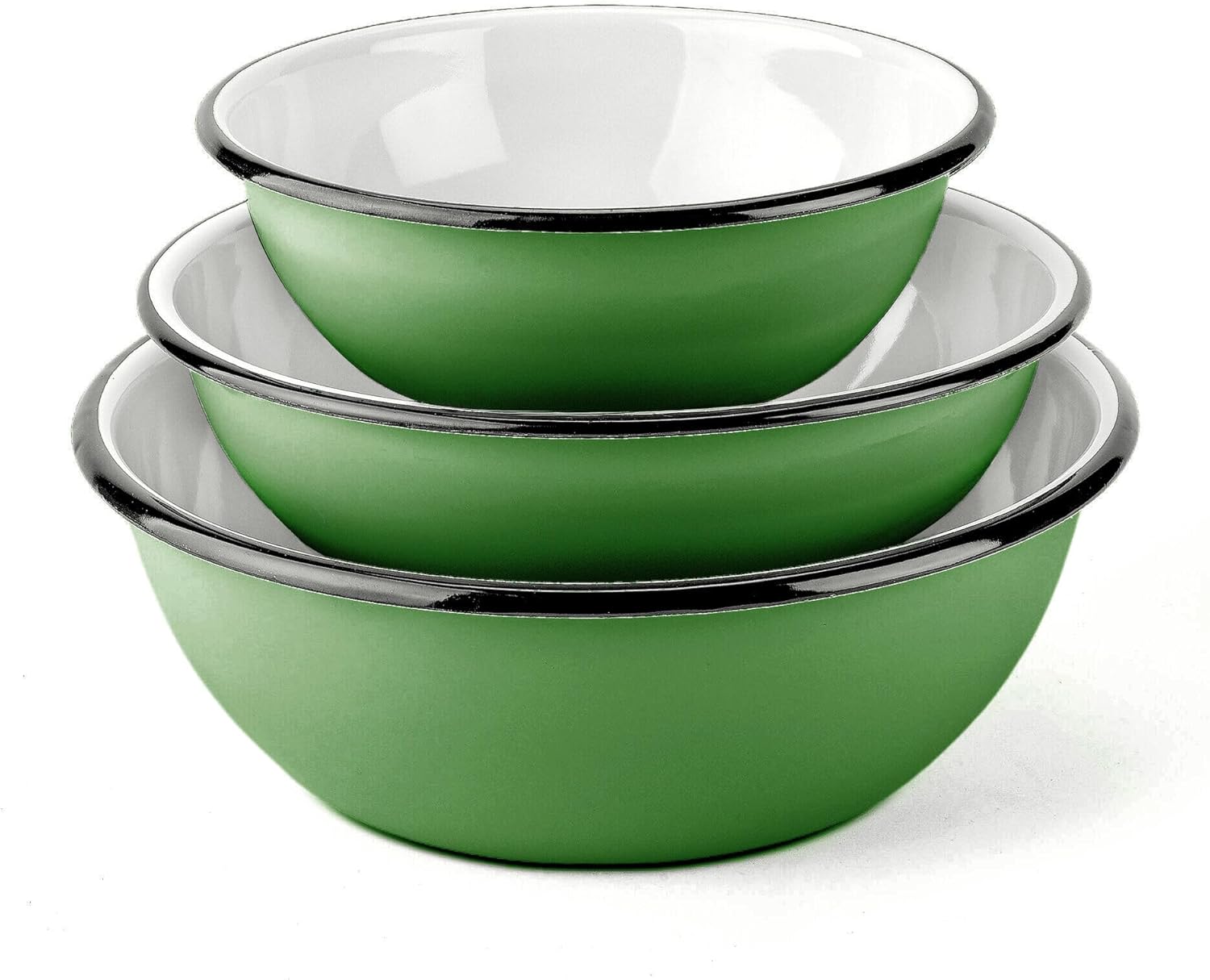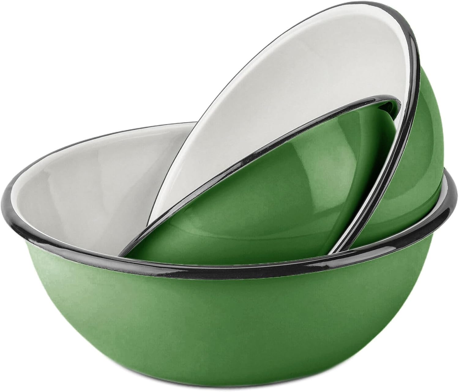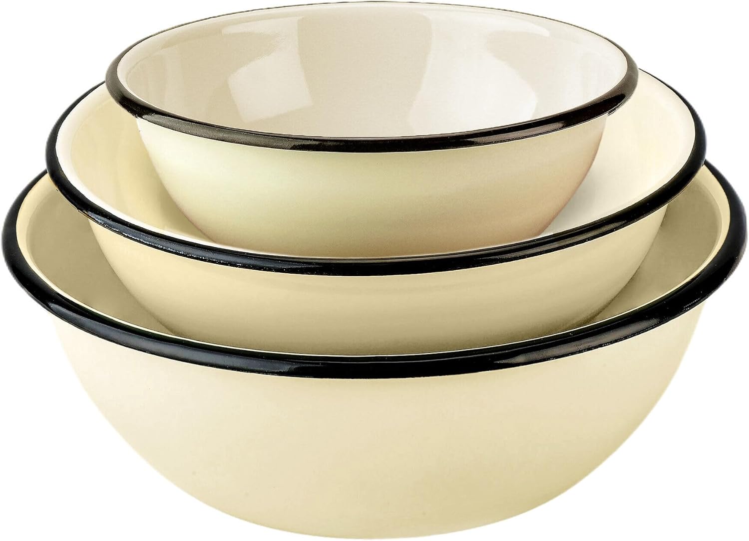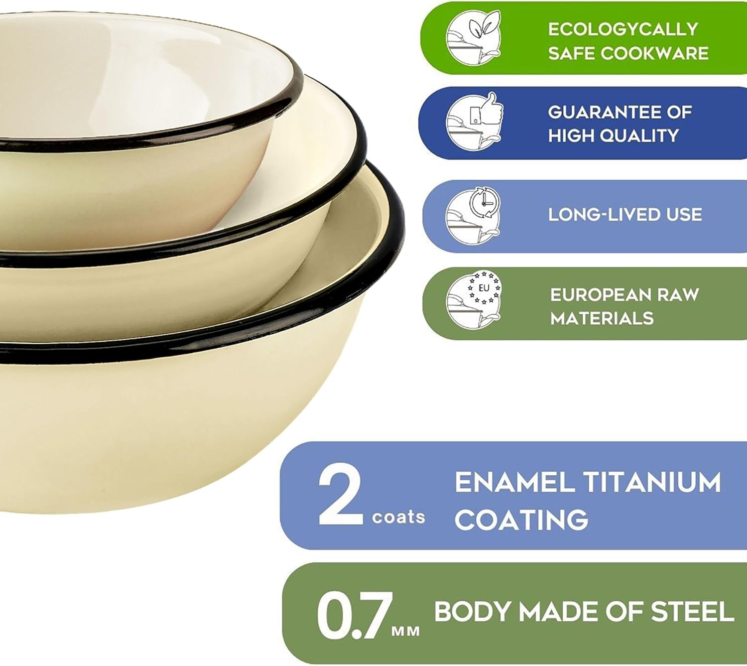 The Enamel Serving Bowl Set combines charm, durability, and versatility, making it a must-have for any kitchen or outdoor dining experience. Crafted from enameled steel, these bowls feature a vintage-inspired design that adds a touch of elegance to your table or picnic setting.The set includes three different capacities - 1.6 Qt (1.5 L), 2.7 Qt (2.5 L), and 4.2 Qt (4 L). Perfect for serving and mixing, the bowls are designed to handle a wide variety of dishes, from salads and pastas to desserts and snacks. Their sturdy construction ensures long-lasting use, while the smooth enamel coating preserves the flavor and freshness of your food.Whether used in a rustic country cabin, a cozy kitchen, or as part of an outdoor dining setup, these bowls are both functional and stylish. The enamel coating resists stains and odors, making cleanup a breeze. Their compatibility with all stove types adds even more utility, allowing you to use these bowls for cooking and serving in a seamless transition.These enamel bowls are dishwasher safe for easy cleaning. With proper care, they will retain their vibrant appearance and functionality for years to come, making them a reliable and attractive addition to your home.Enhance your dining and cooking experience with the Enamel Serving Bowl Set, a versatile and stylish solution for both everyday meals and special occasions.